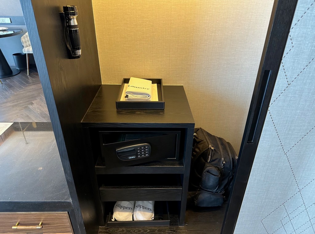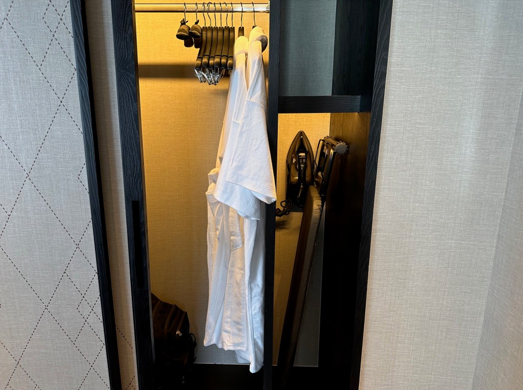 The closet is located before the entrance to the bathroom. It is fully equipped with an iron, a safe, bathrobes, and slippers. There is also a table next to the closet where you can place large suitcases.