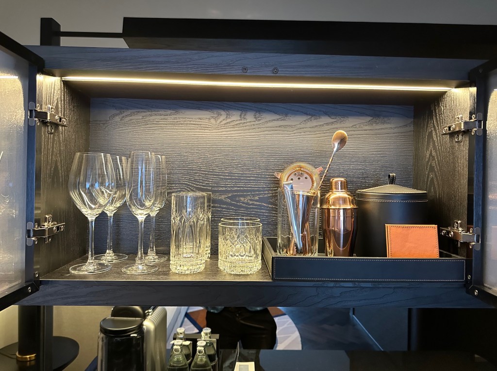 เดินเข้ามาจะเจอในส่วนของมินิบาร์อยู่ทางขวามือนะครับ ตู้ด้านบนจะเป็นแก้วน้ำ และขนมทานเล่น ที่จะต้องจ่ายเงินนะครับ