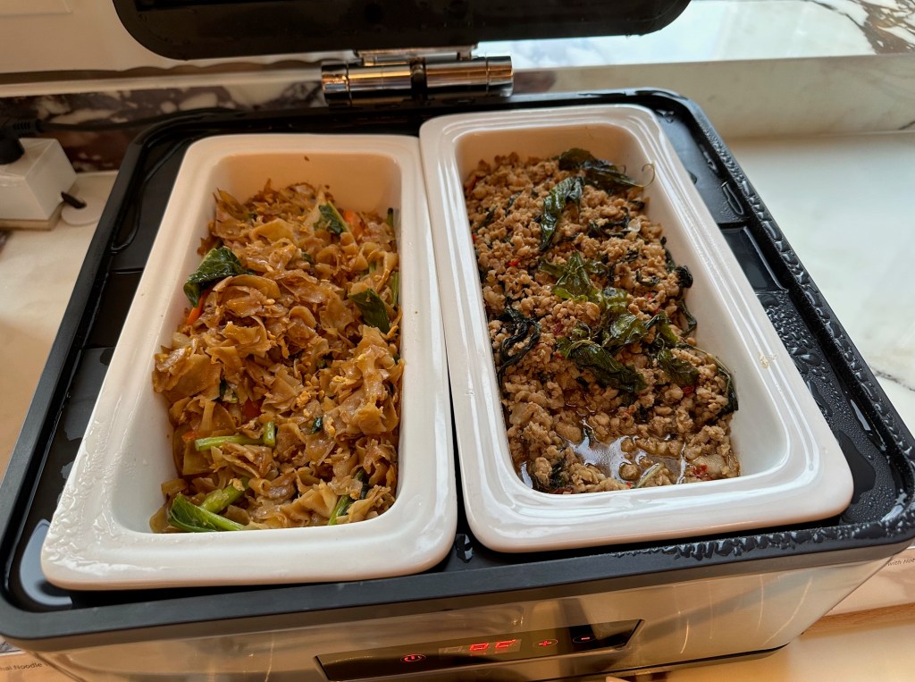 The Thai food line includes fried rice and stir-fried shrimp with green peppers. The shrimp are large.