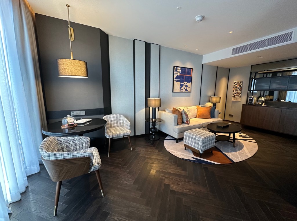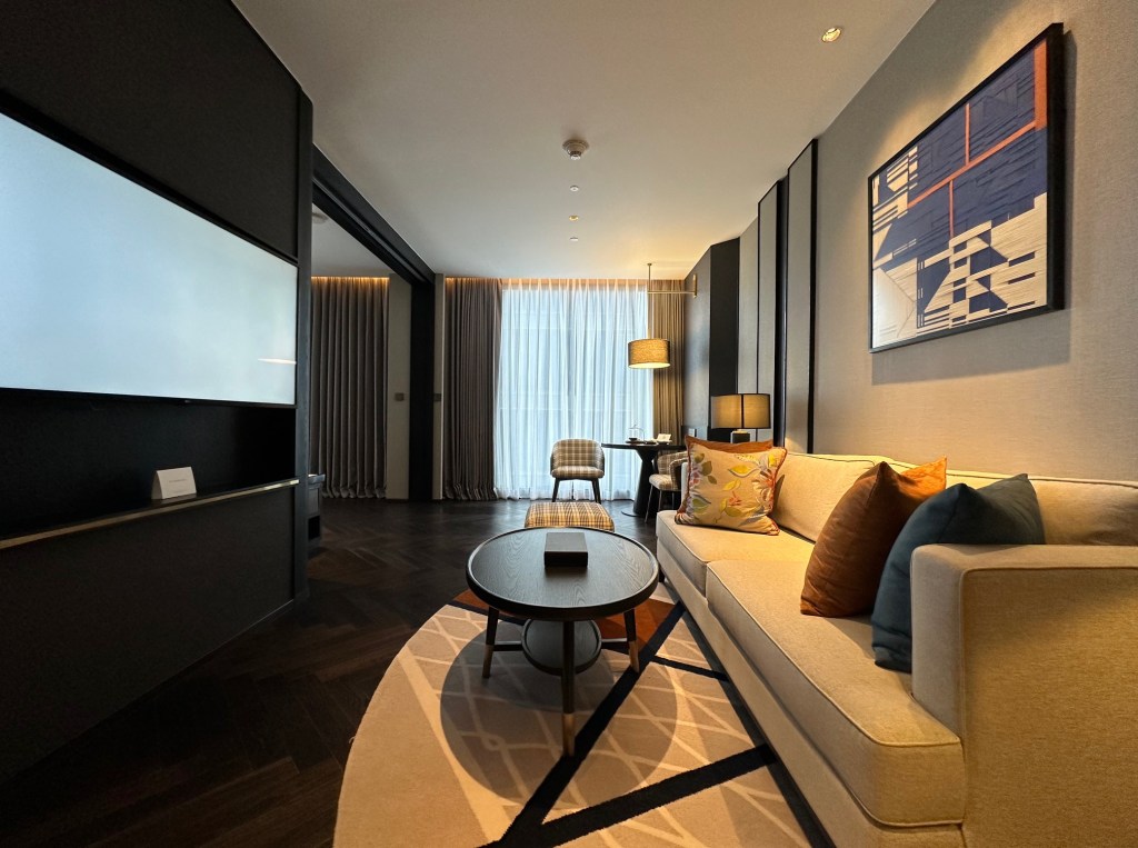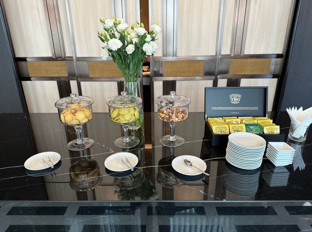 When you enter the room, you will first see the living room. There is a large comfortable sofa in the middle of the room. To the right, you will find the minibar. The top cabinet contains glasses and snacks that are for purchase. The hotel provides a Nespresso coffee machine and TWG tea, which are standard amenities at InterContinental hotels in Thailand. The minibar is well-stocked, but drinks are for purchase. For Club guests, non-alcoholic drinks are free of charge.