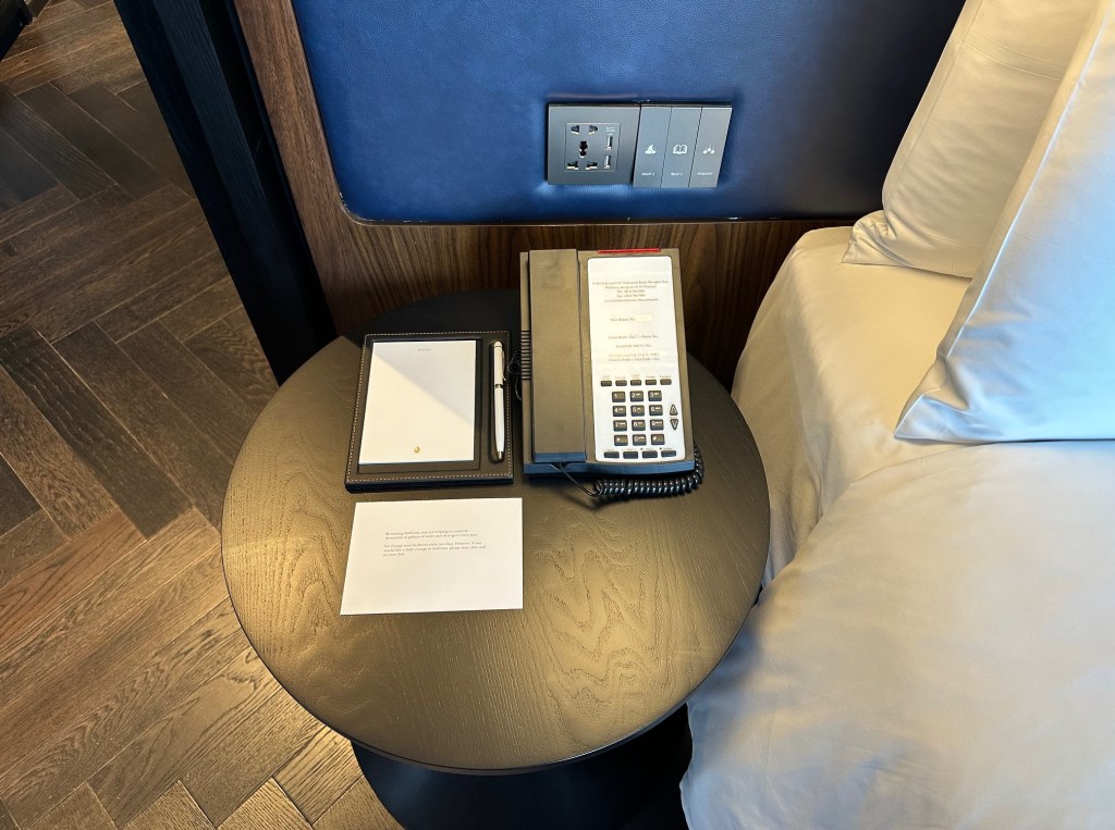 โต๊ะข้างเตียงมีโทรศัพท์ ที่บุบตกแต่งเตียง สวยงามมากๆ การนำเอาเทคนิค ผ้าทอมือ ลวดลายการถักทอ มาตกแต่งนะครับ