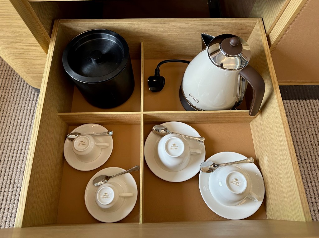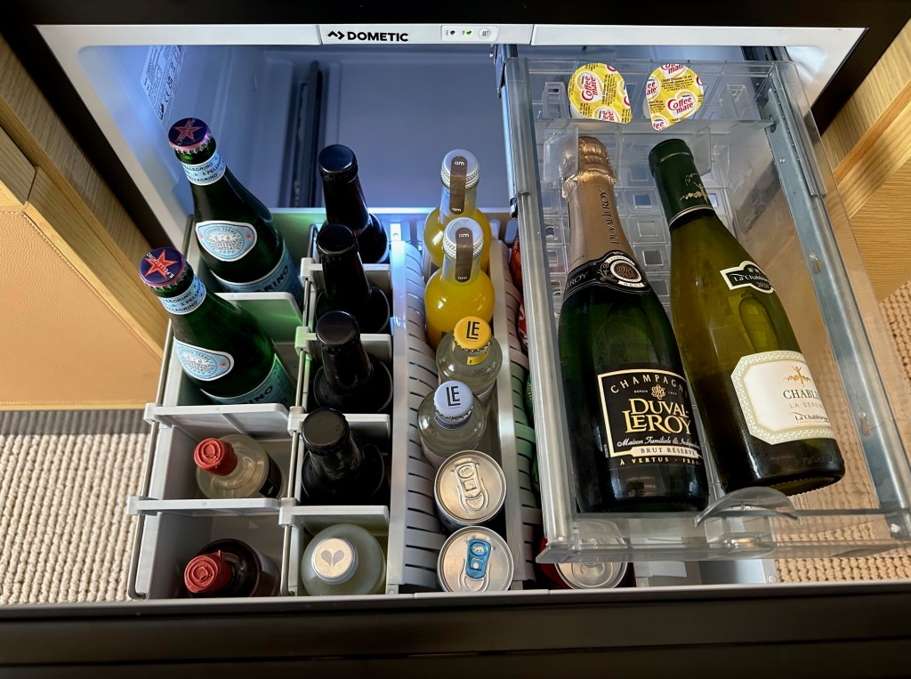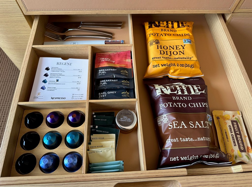 Big TV 65 inches, full minibar But there is a cost. I use TEACha’s tea. There is a Nespresso coffee machine.