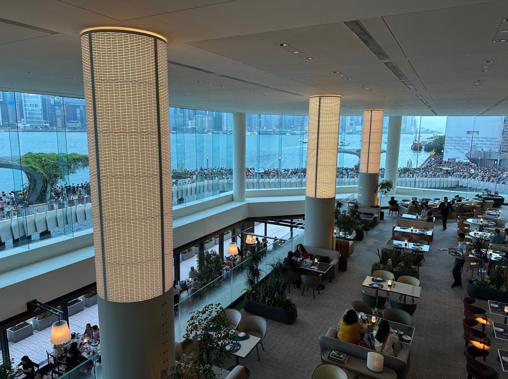 You can see Victoria Harbor in full. Sit and enjoy the view all day. Especially at night, it’s very beautiful.