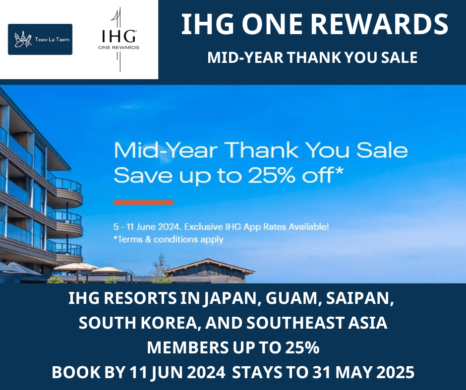 The IHG One Rewards Mid-Year Thank You Sale (the “offer”) is valid only for selected bookings made by IHG One Rewards members from 0am (JST) on 5 June 2024 to 11:59pm (JST) on 11 June 2024 (both dates inclusive) (the “Booking Dates”) for stays at participating IHG® branded hotels in Japan, Guam, Saipan, South Korea, Indonesia, Laos, Malaysia, Maldives, Philippines, Singapore, Thailand and Vietnam, from 8 June 2024 until the end of inventory (the “Stay Dates”) using the “Book Early & Save – IHG One Rewards Member Rate” and “Book Early & Save with Breakfast – IHG One Rewards Member Rate”.
