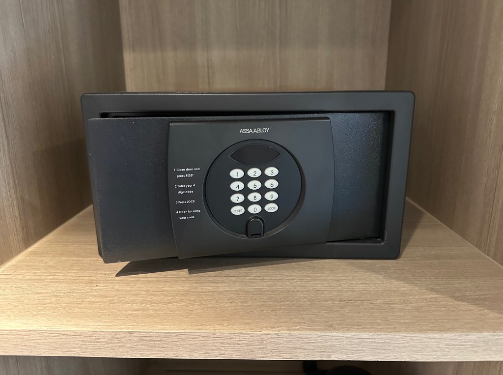 The closet has a safe for storing valuables.