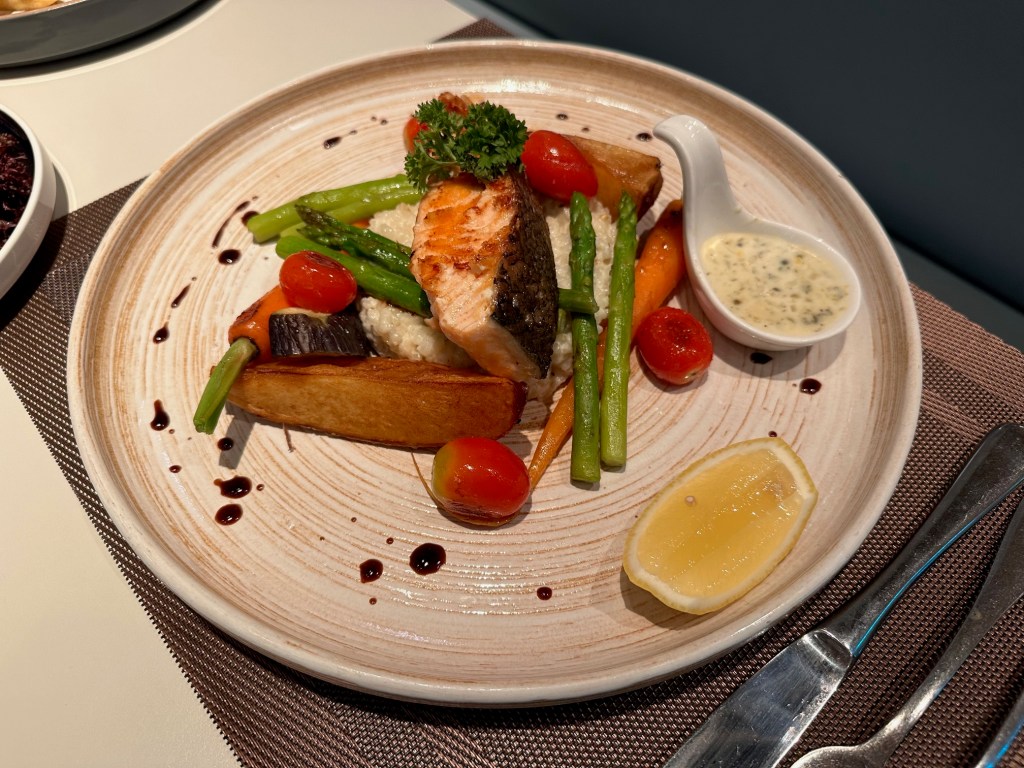 Salmon Steak จานสเต็กจานดีมากกกก อร่อยสุดๆๆ แบบเสิร์ฟโรงแรม 5 ดาวได้สบายๆ เลย แซลมอนทอดมาได้ดีสุดๆ เนื้อฉ่ำ และกำลังดีเลยครับ