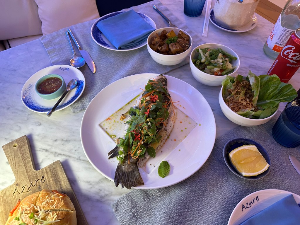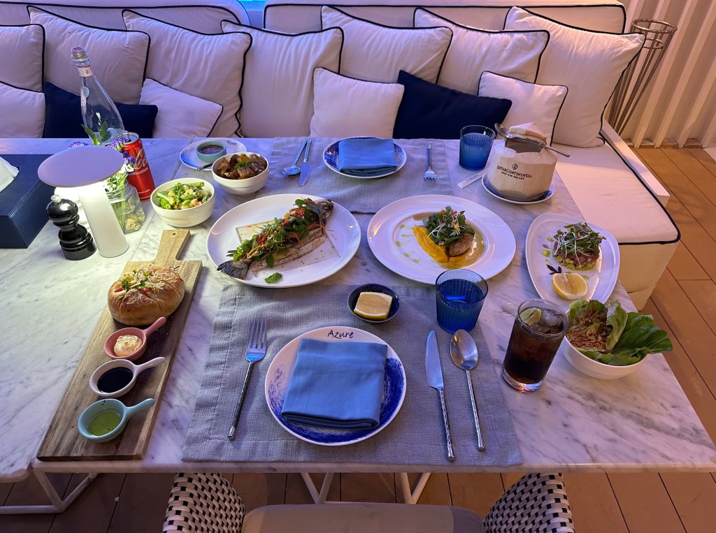 Let’s have dinner at Azure. It’s located right by the beach and has a fantastic atmosphere.