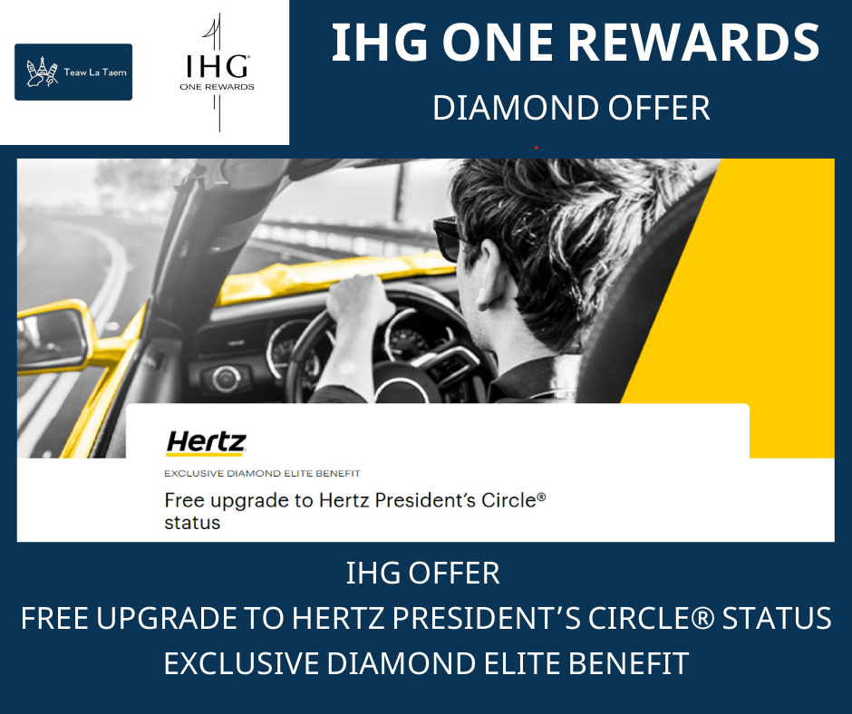Ready to ride in style? IHG One Rewards has teamed up with Hertz® to extend Diamond Elite members a complimentary upgrade to Hertz Gold Plus Rewards President’s Circle® status.