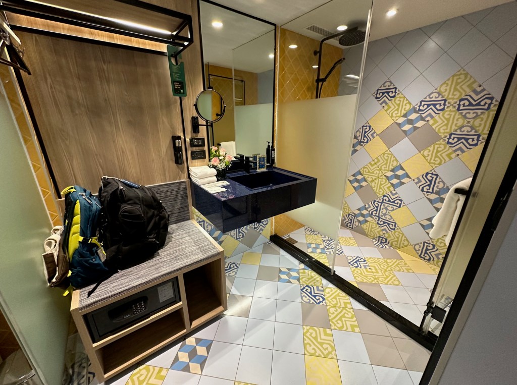 The bathroom has an open layout, without a dividing door, to maximize space. The wardrobe is a freestanding unit with a hanging space and luggage rack. However, the toilet and shower area are separated by doors for privacy.