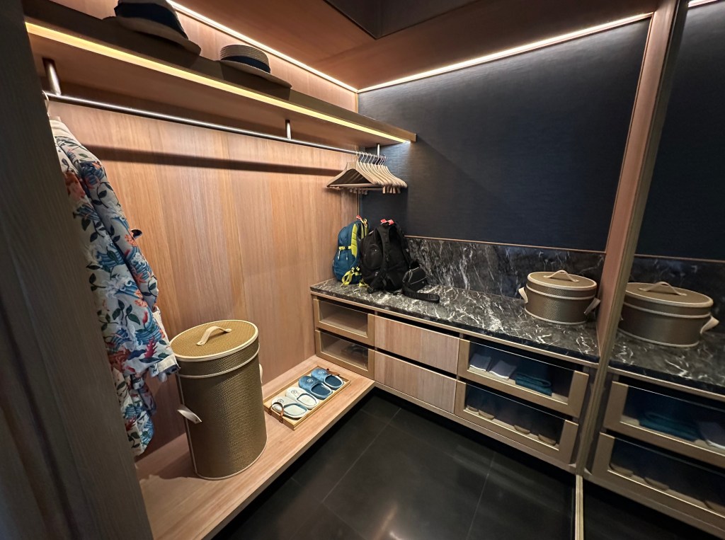 Walking in, you’ll find a very large dressing room with luggage space and floating clothes racks.