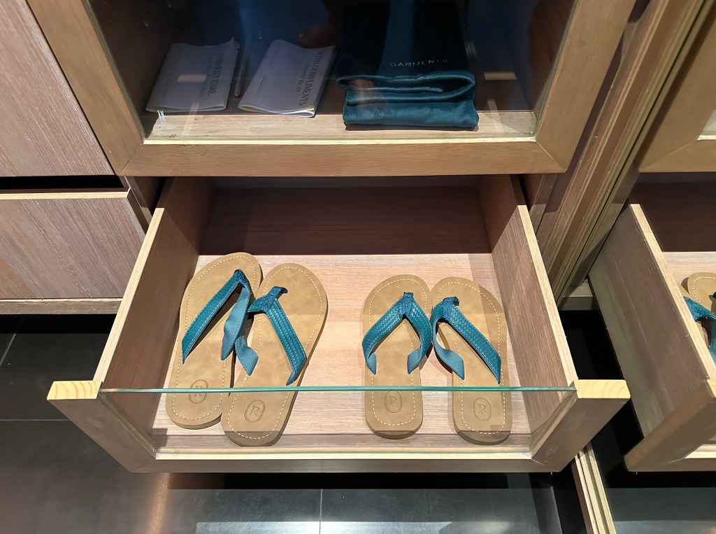 The bathrobes have a special design, very beautiful and luxurious. Slippers, beach walking shoes, and beautiful hats are also provided (there’s a charge if you take them home).