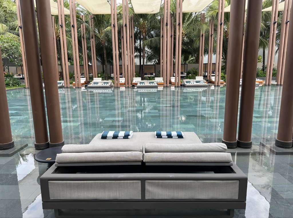 Upon arriving on the 10th floor, you’ll first encounter the outdoor area. The Regent Club is located on the left-hand side, featuring an incredibly private pool exclusively for the 10th floor, with a fantastic view. There are also seating cushions available for enjoying the scenery.