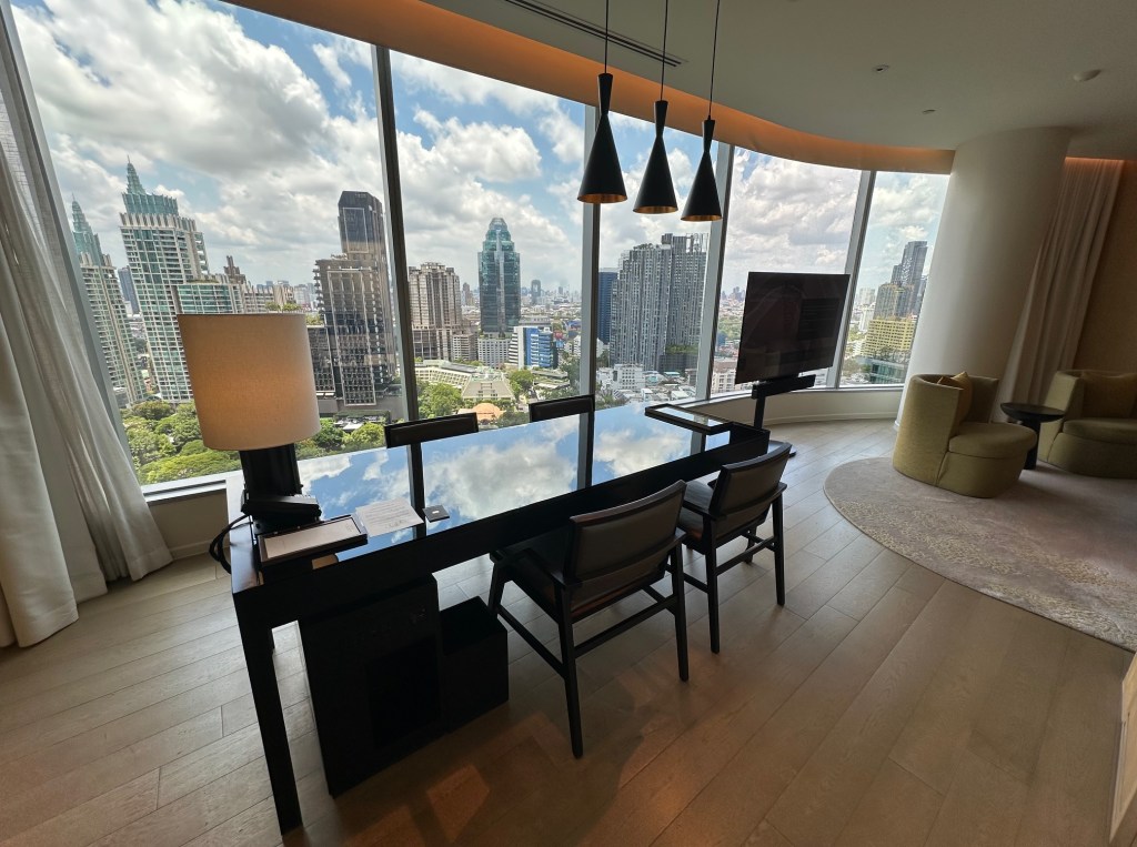 The living room offers a view of the British Embassy, where the new Central project will be located. The large glass windows provide an expansive, unobstructed vista. The living room features a spacious work desk suitable for serious business meetings, complete with meeting equipment. There’s also a comfortable sofa tucked into a corner of the room, along with a large TV.
