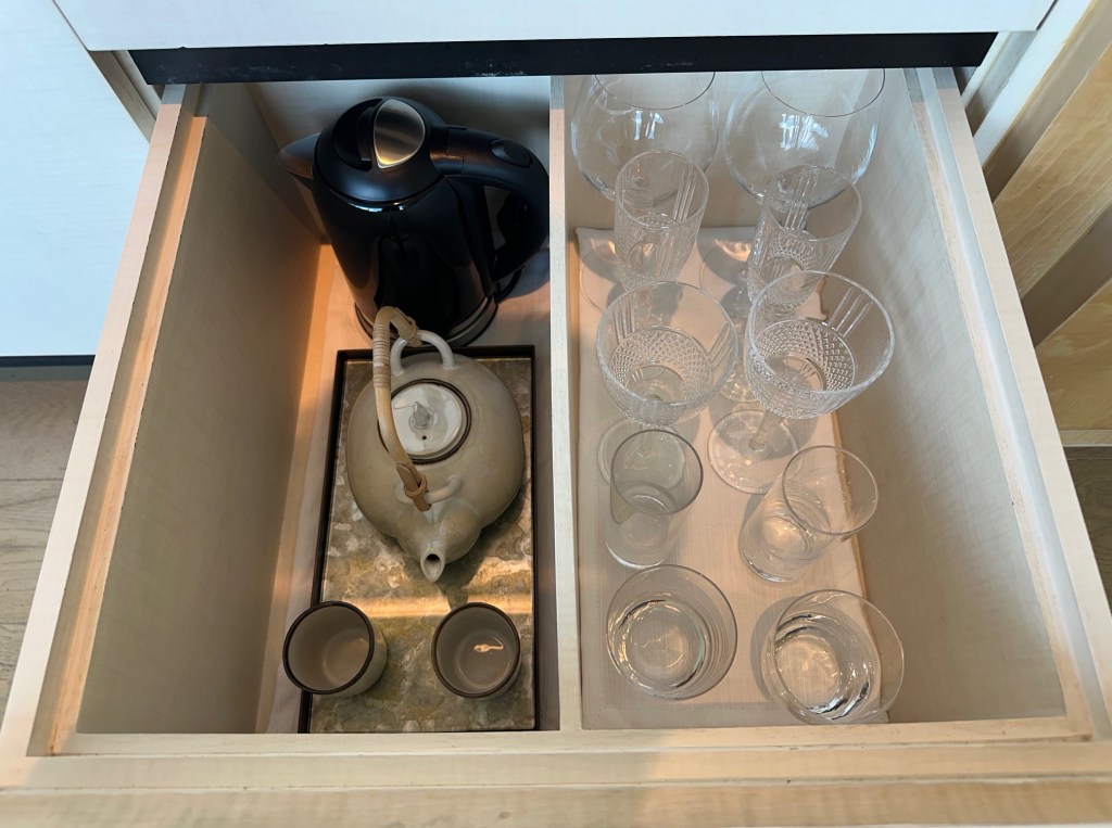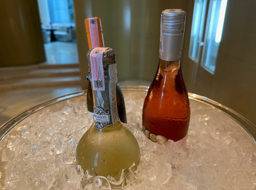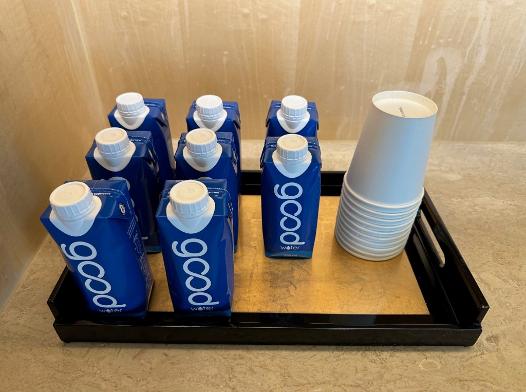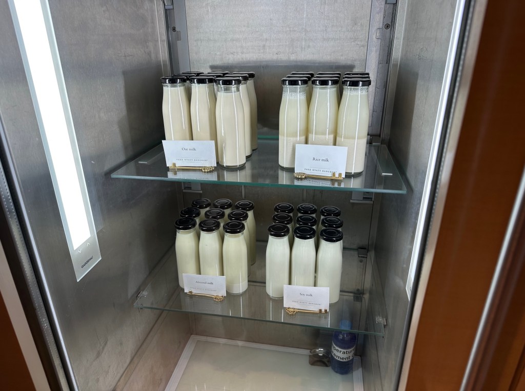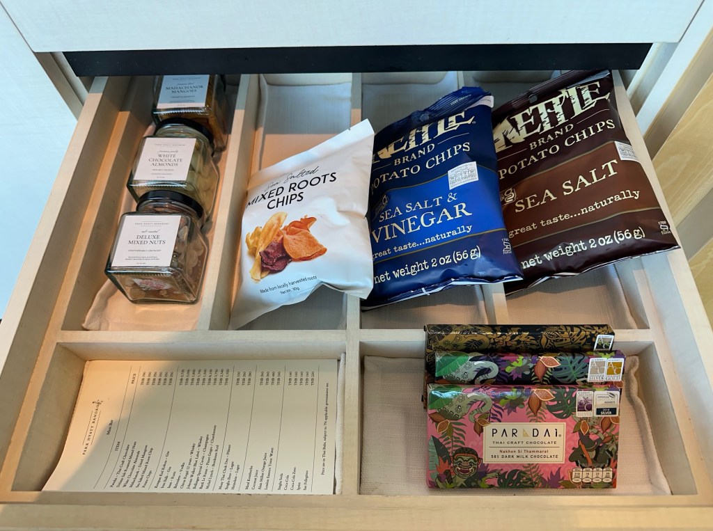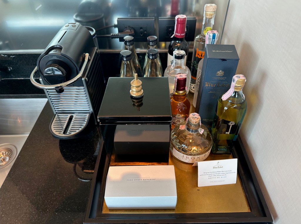 The minibar is fully stocked, including high-end alcoholic beverages like Blue Label (available for an additional charge). The tea selection features Thai brands like Chaidim, popular in many ultra-luxury hotels in Thailand, and there’s a Nespresso coffee machine. A very large refrigerator holds stylish glass bottled water, and ice can be requested from staff.