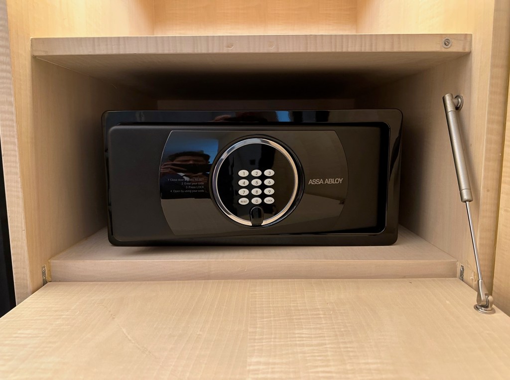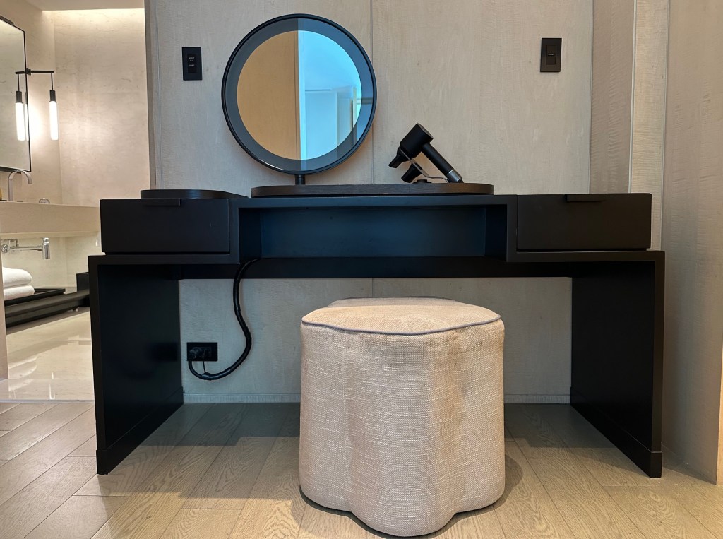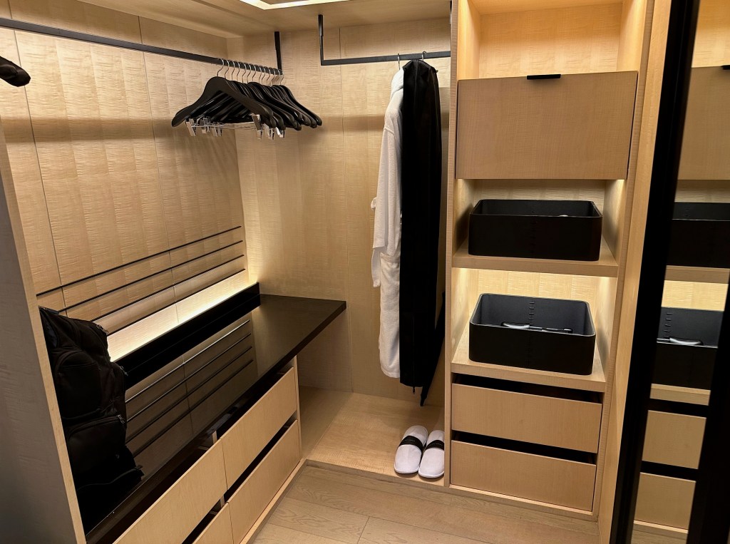 The bedroom connects to a dressing table and a walk-in closet with ample hanging space and a large luggage rack. Soft bathrobes, slippers, and a safe are provided. In addition to these, a steam iron is also available.