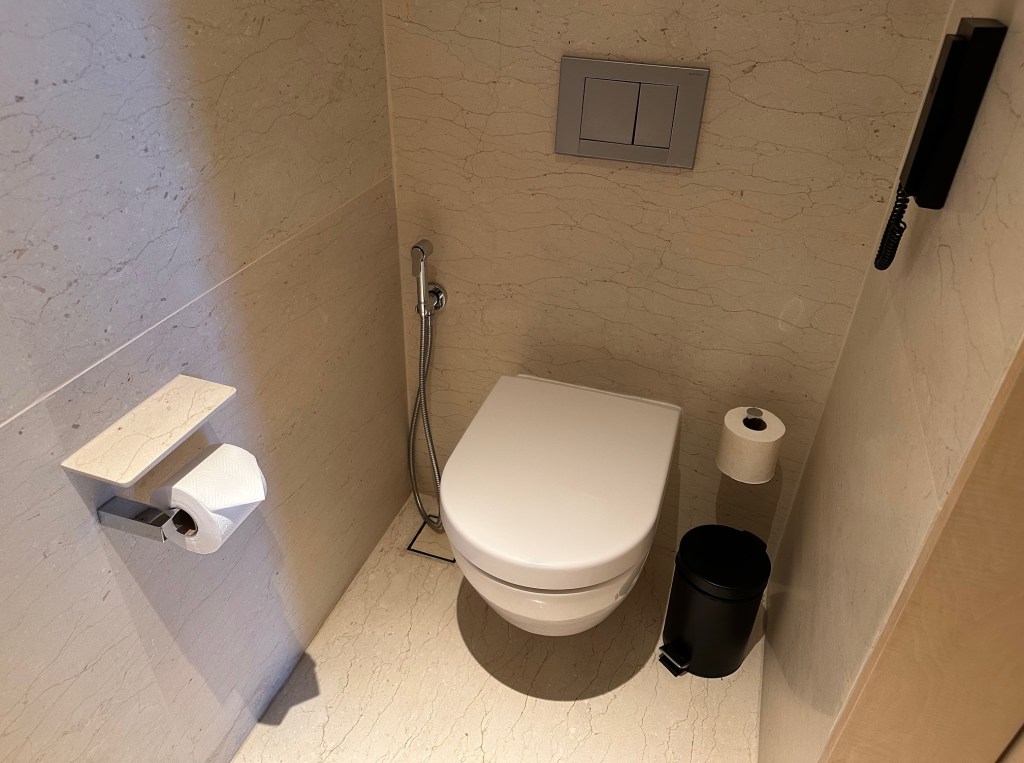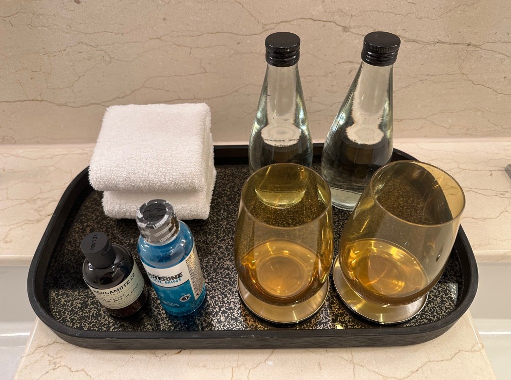 A separate toilet room is detached from the main shower area, and it includes a bidet spray. The bathroom is opulent, featuring a very large bathtub and a TV, as is customary in ultra-luxury hotels. The vanity is a His & Hers style, allowing two people to use it simultaneously. The amenities are comprehensively stocked with the highly fragrant LE LABO brand in generous sizes. Furthermore, all necessary toiletries, from toothbrushes and razors to mouthwash, are perfectly provided.
