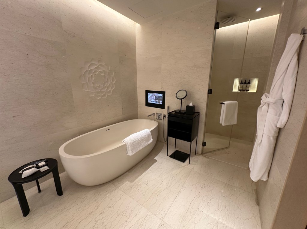 A separate toilet room is detached from the main shower area, and it includes a bidet spray. The bathroom is opulent, featuring a very large bathtub and a TV, as is customary in ultra-luxury hotels. The vanity is a His & Hers style, allowing two people to use it simultaneously.