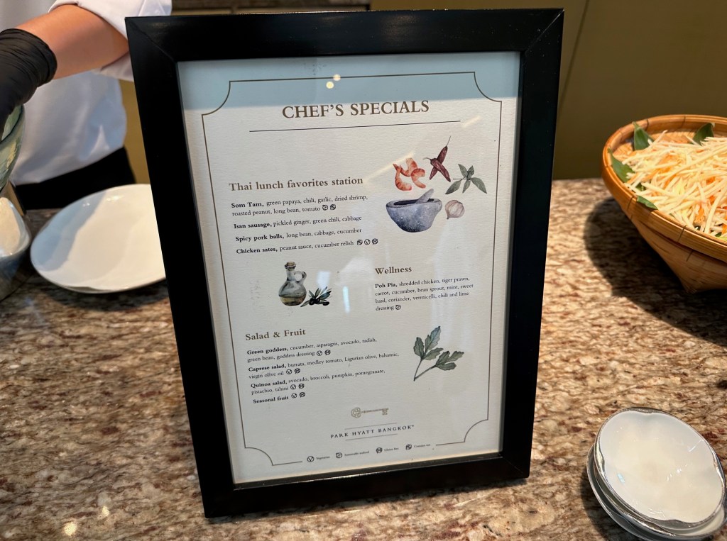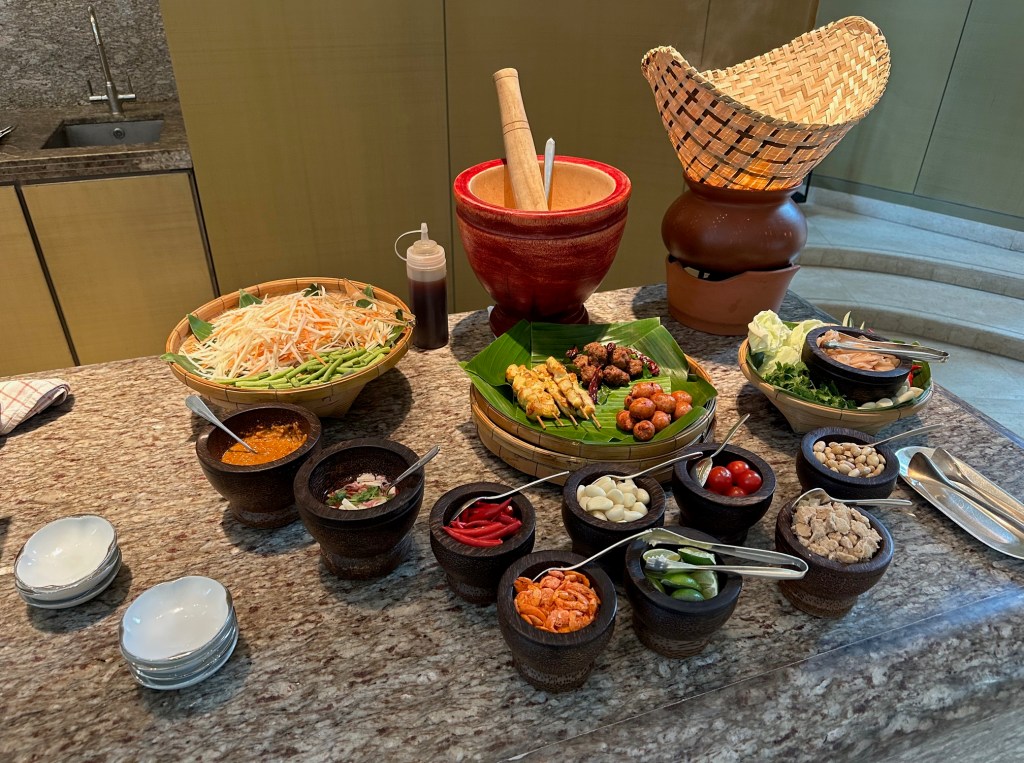 Starting with lunch, Thai dishes are featured. There’s a Thai station with items like deep-fried Laab, Isaan sausage, and chicken satay—everything is delicious! There’s even Som Tum (papaya salad) that the chef can prepare fresh for you. Additionally, there are fresh spring rolls with your choice of shrimp or chicken filling, which are incredibly tasty.