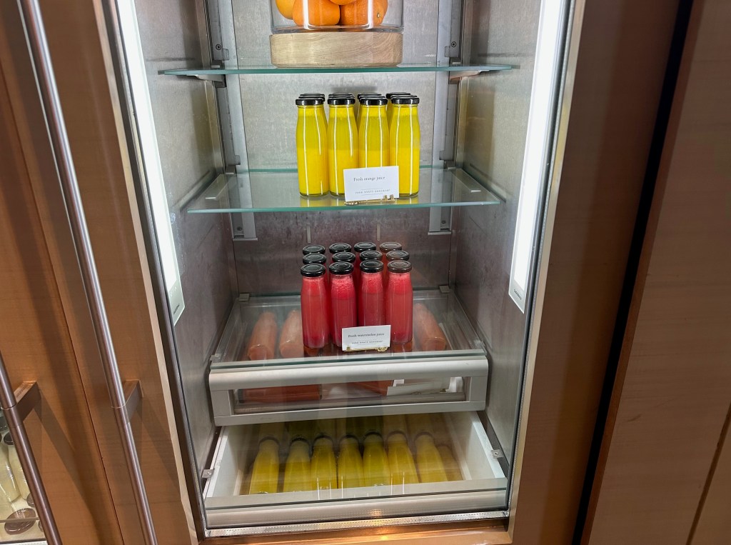 ตู้เย็นขนาดใหญ่มากๆ และน้ำดื่มให้บริการ เป็นแบบขวดแก้ว ดูหรูหราเป็นอย่างมากๆ ที่น้ำแข็ง สามารถแจ้งให้พนักงานมาบริการได้