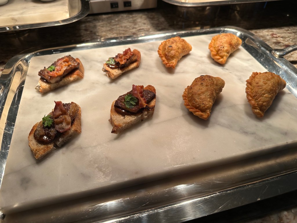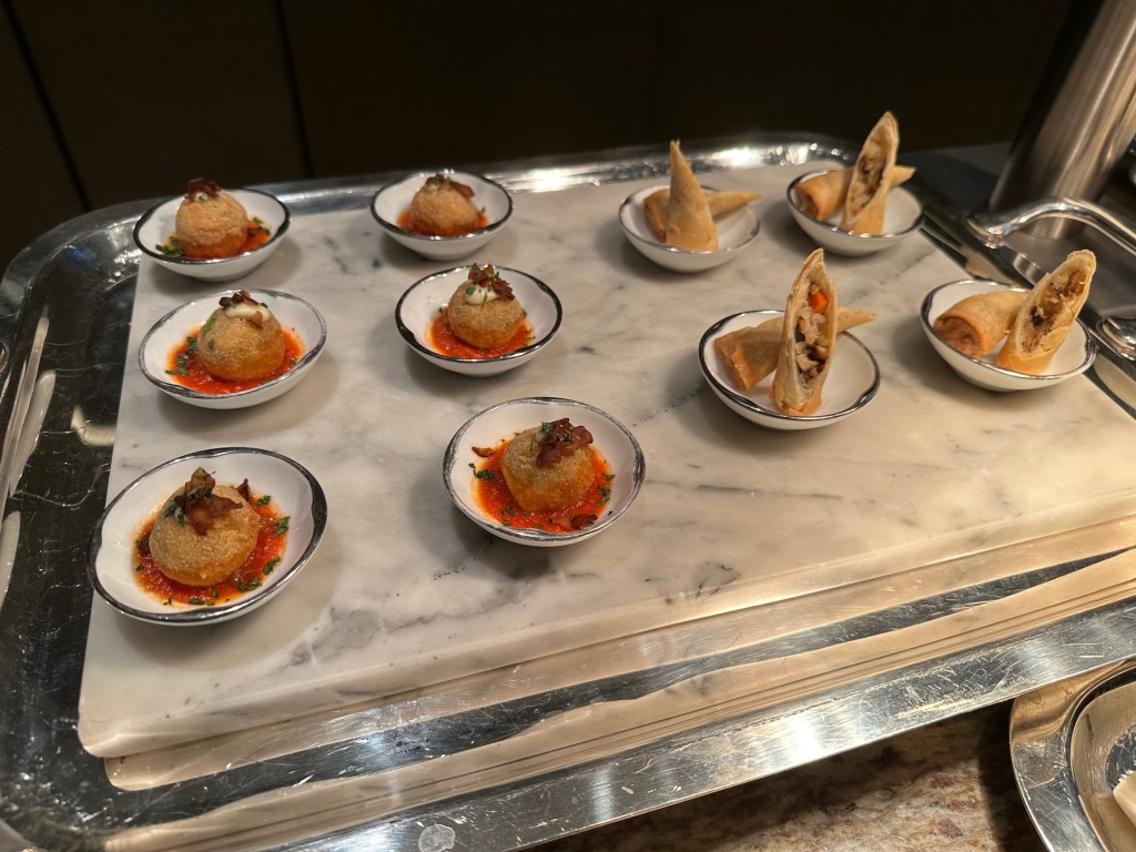 You’ll also find various salads such as Green Goddess, Caprese Salad, and Quinoa Salad, which you can serve yourself or have the staff assist you. Fresh fruits and other items are also available.