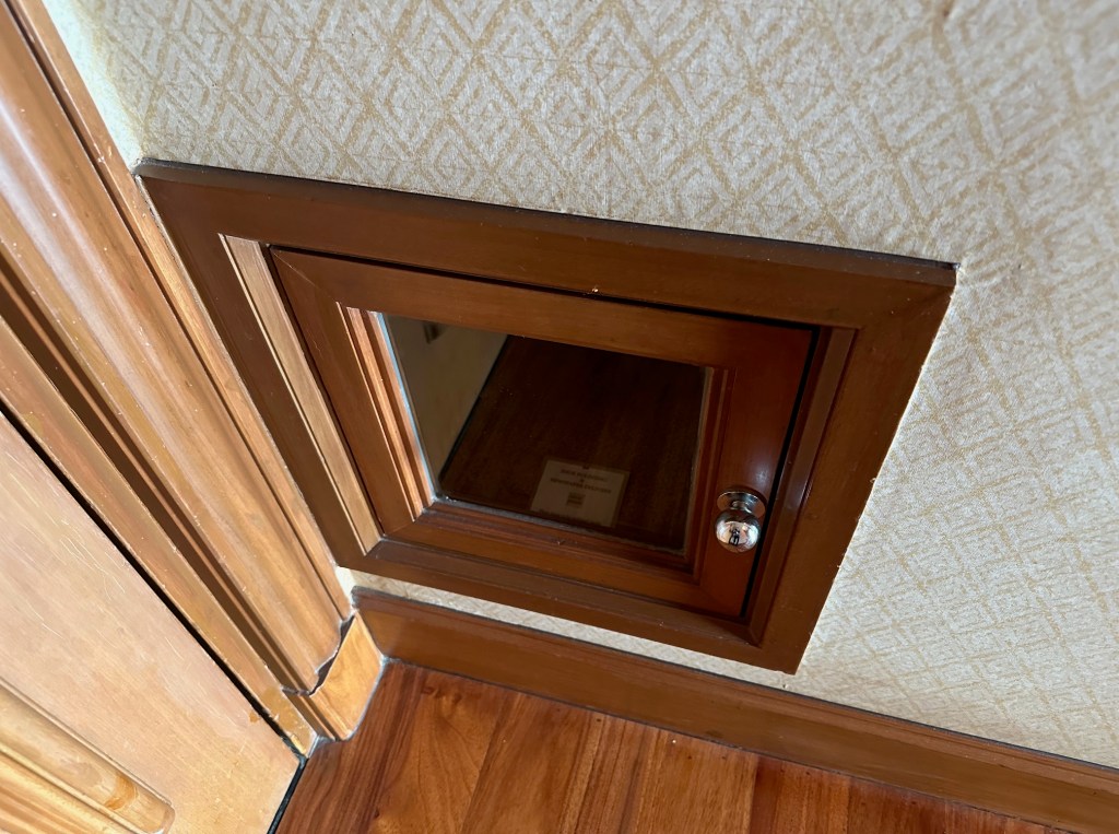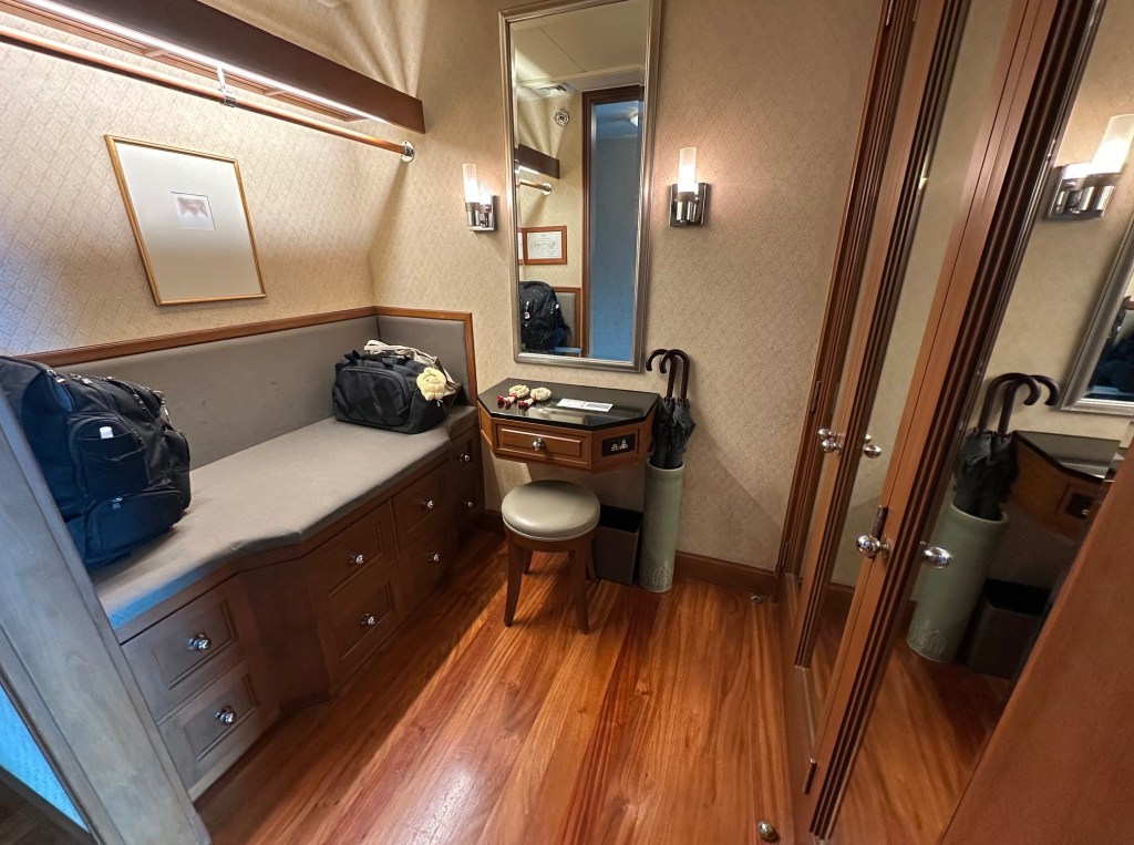 You’ll find a convenient vanity table for makeup. A unique service here is a small cabinet where you can place your leather shoes for the staff to clean and polish.