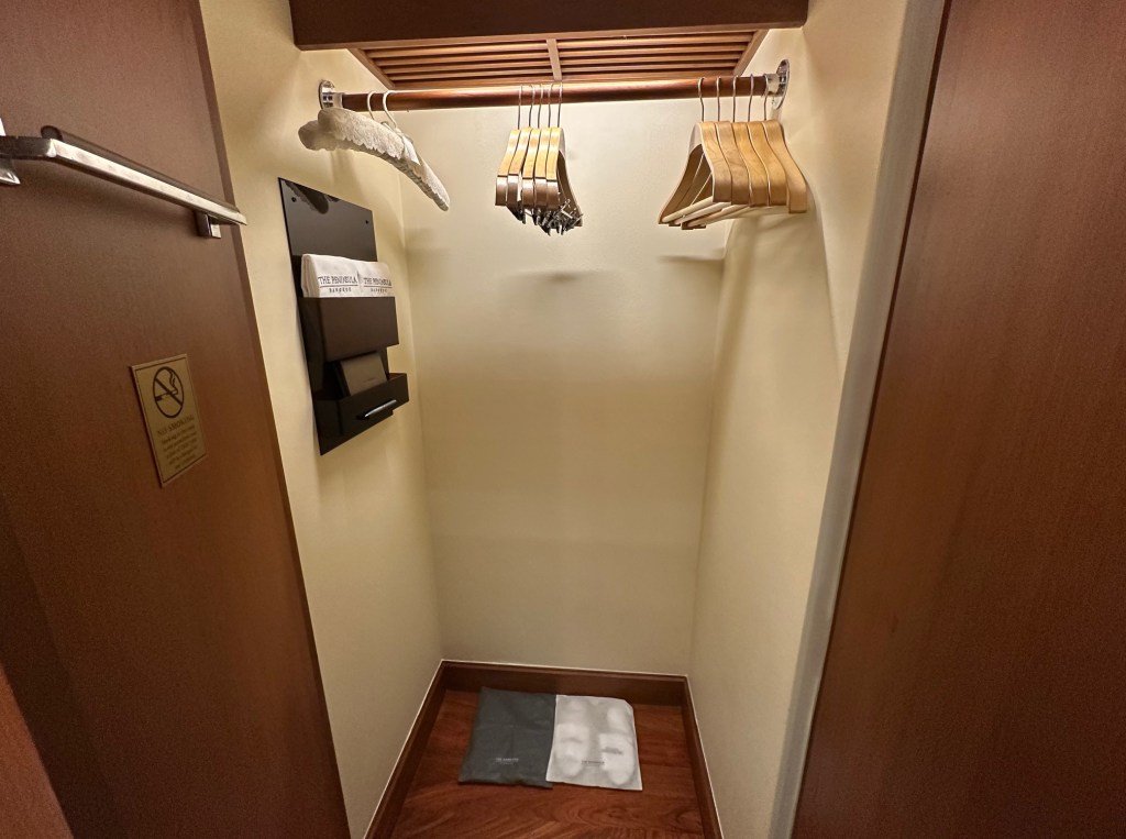 Upon entering the room, you’ll find a dedicated area for luggage and a wardrobe, fully equipped with amenities like bathrobes and slippers. There’s also a small foyer just inside the door, providing a sense of privacy and shielding the room from immediate view.