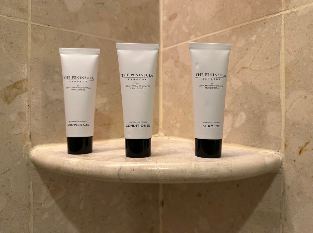 All the amenities are generously provided, including toothbrushes. The shampoo and soap come in elegant, fragrant aluminum tubes, exclusive to the Peninsula brand.