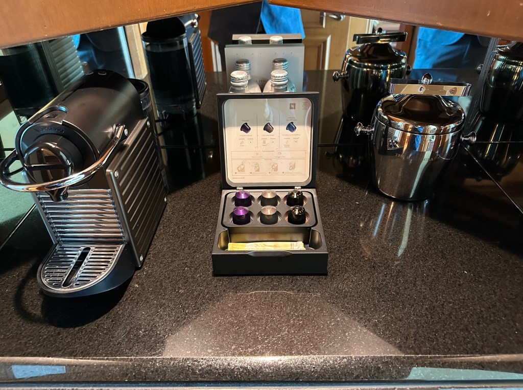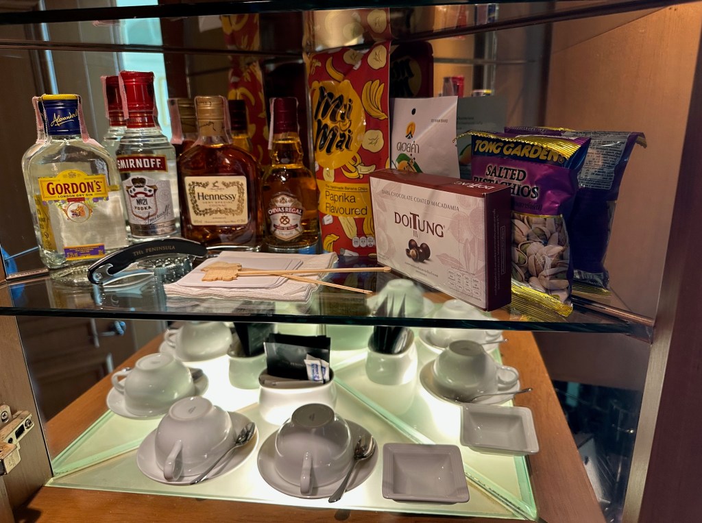The minibar is exceptionally well-stocked, featuring coffee and The Peninsula’s beautiful, recyclable aluminum water bottles.