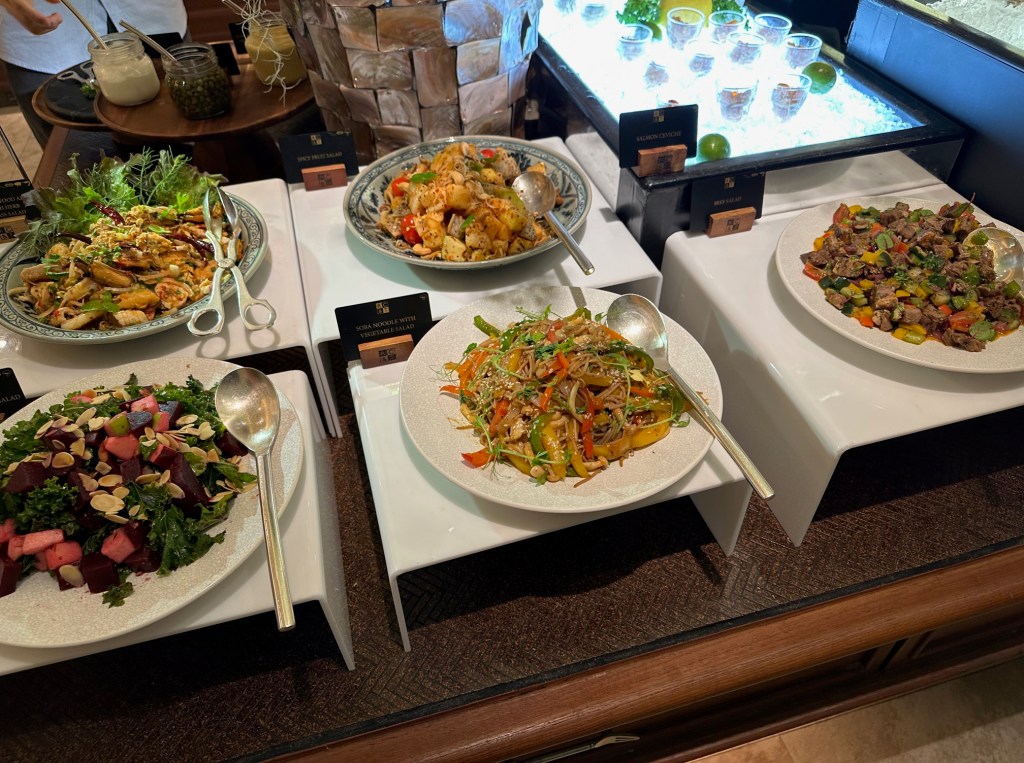 The buffet also features a diverse selection of salads and Thai-style salads (Yum), smoked salmon, and Japanese food including sushi and sashimi.
