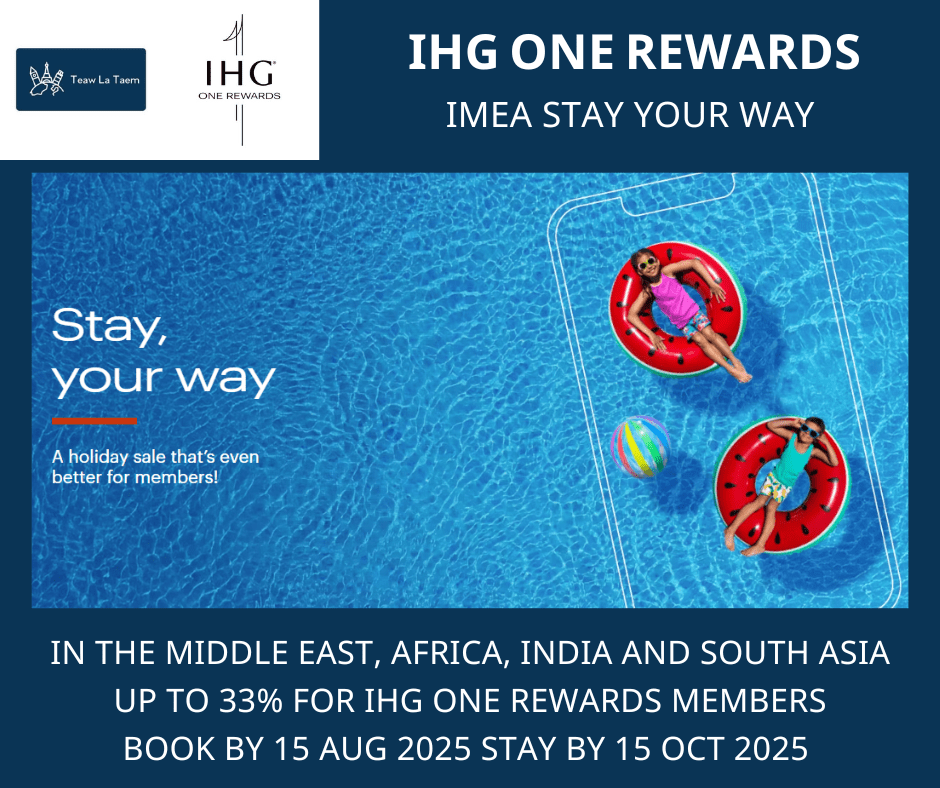 The Stay, Your Way Tactical Campaign (the “Campaign”) is valid for selected bookings made from 2 July 2025 until 15 August 2025 (both dates inclusive) (the “Booking Dates”) for stays at participating IHG branded hotels and resorts from 5 July until 15 October 2025 (both dates inclusive) (the “Stay Dates”) using the “Book Now Pay Later” and “Book Now Pay Later – IHG One Rewards Member Rate” during the Booking Dates.