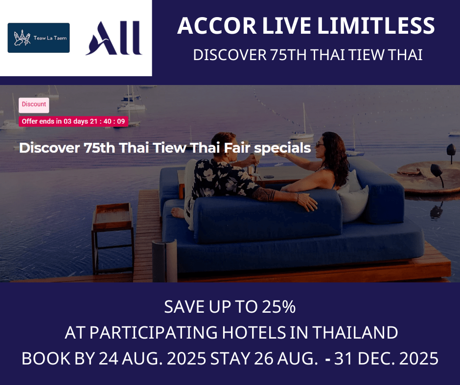 - This offer is valid for bookings made from 21 August to 24 August 2025, for stays between 26 August and 31 December 2025 at participating hotels in Thailand. See the participating hotel list HERE. Offer is subject to availability.
