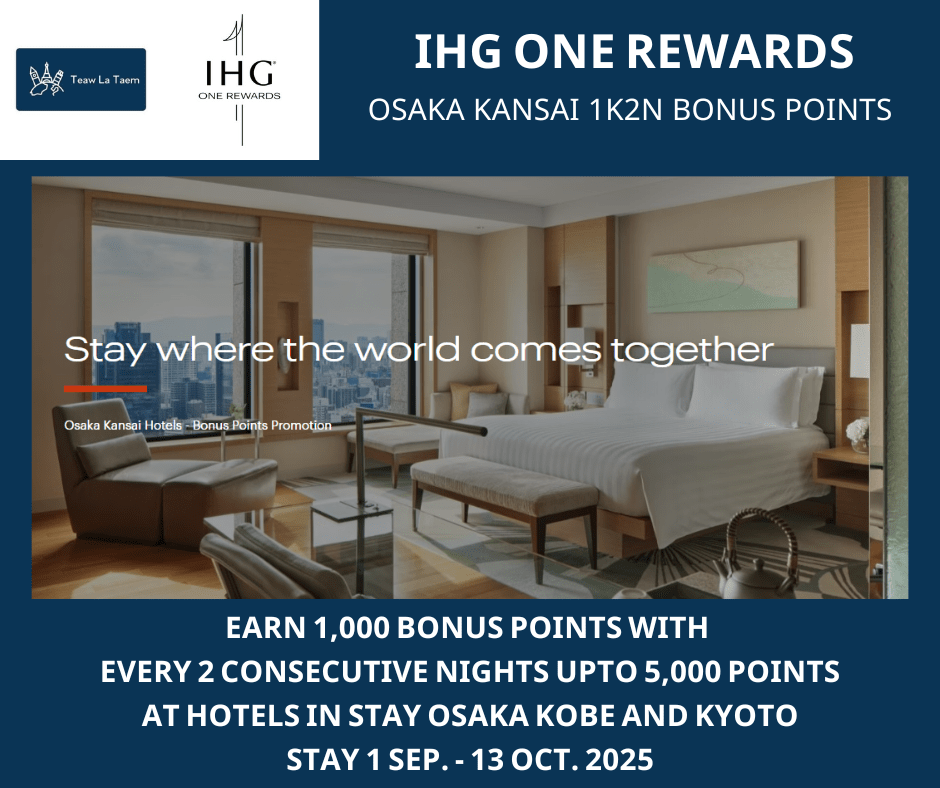 Book now and stay via the IHG website or IHG One Rewards app between 1 September and 13 October 2025, and earn 1,000 bonus points for every 2 consecutive nights at participating hotels in Osaka, Kyoto and Kobe—up to 5,000 points.