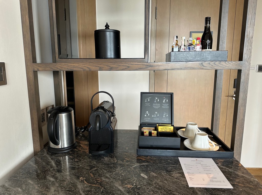 The minibar includes a Nespresso machine and TWG tea. Other beverages in the mini-fridge are available for a fee.