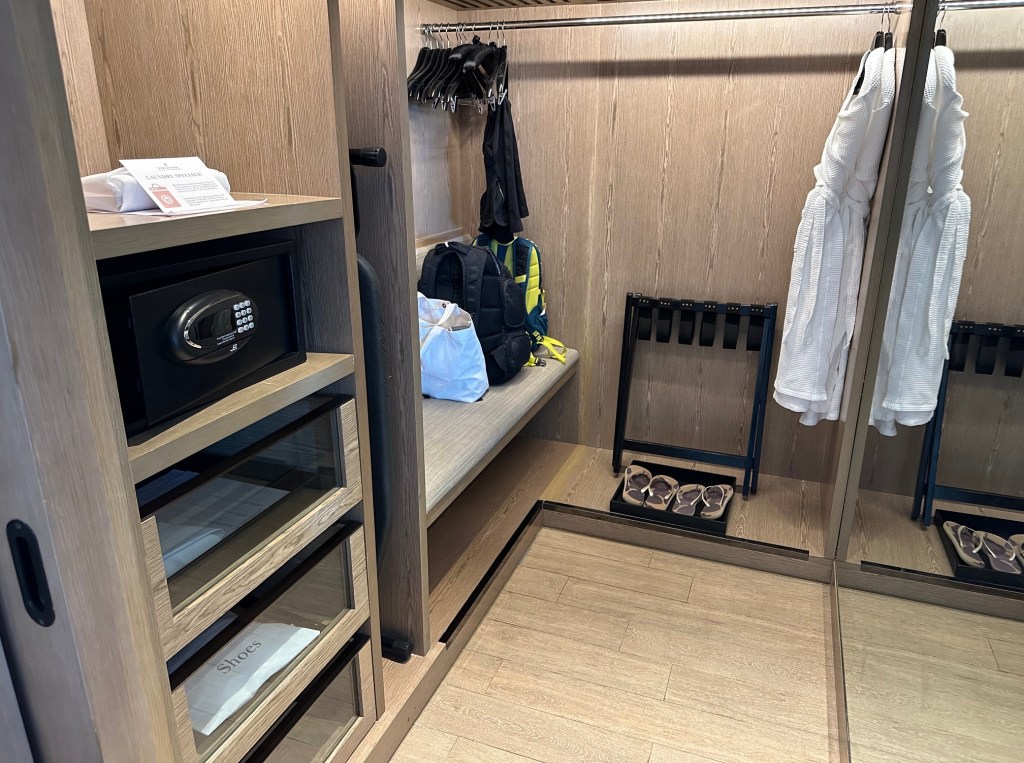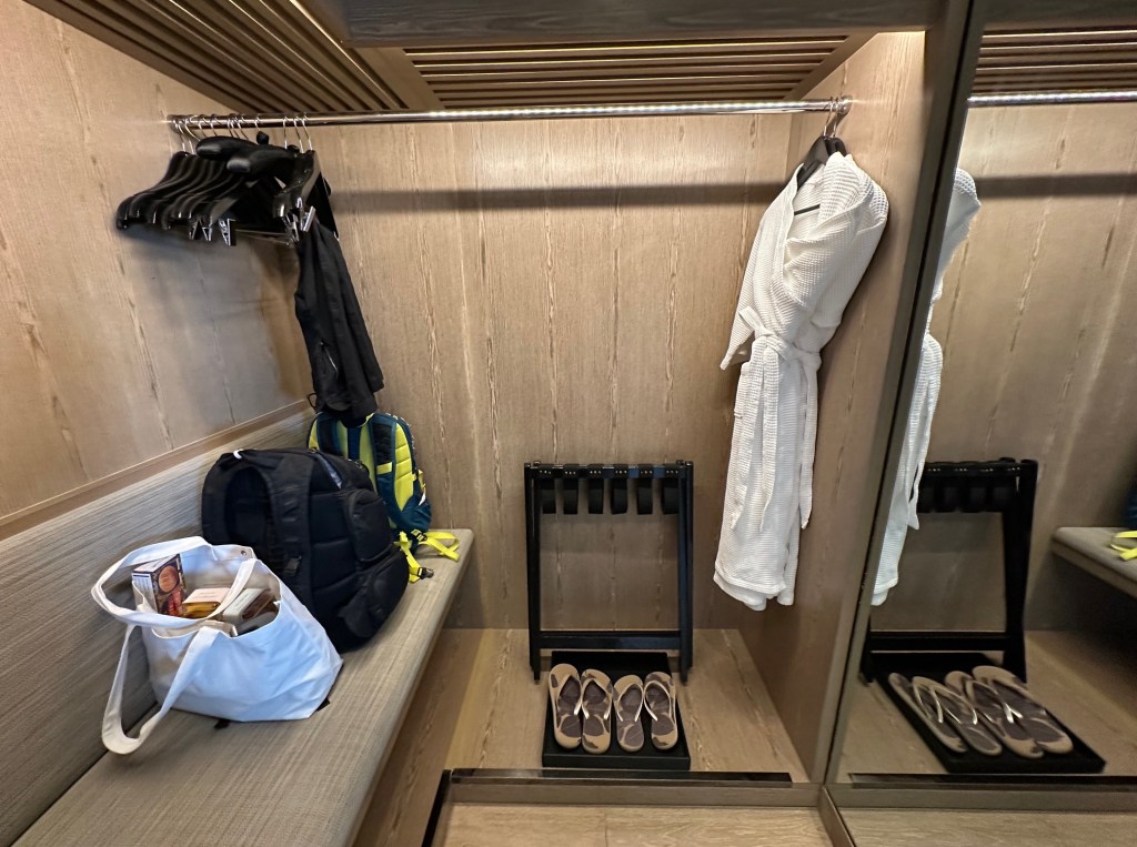 Upon entering, to the right, you’ll find the wardrobe area. There’s a large luggage rack, a hanging clothes rack, slippers, bathrobes, beach sandals, a safe, and an iron.