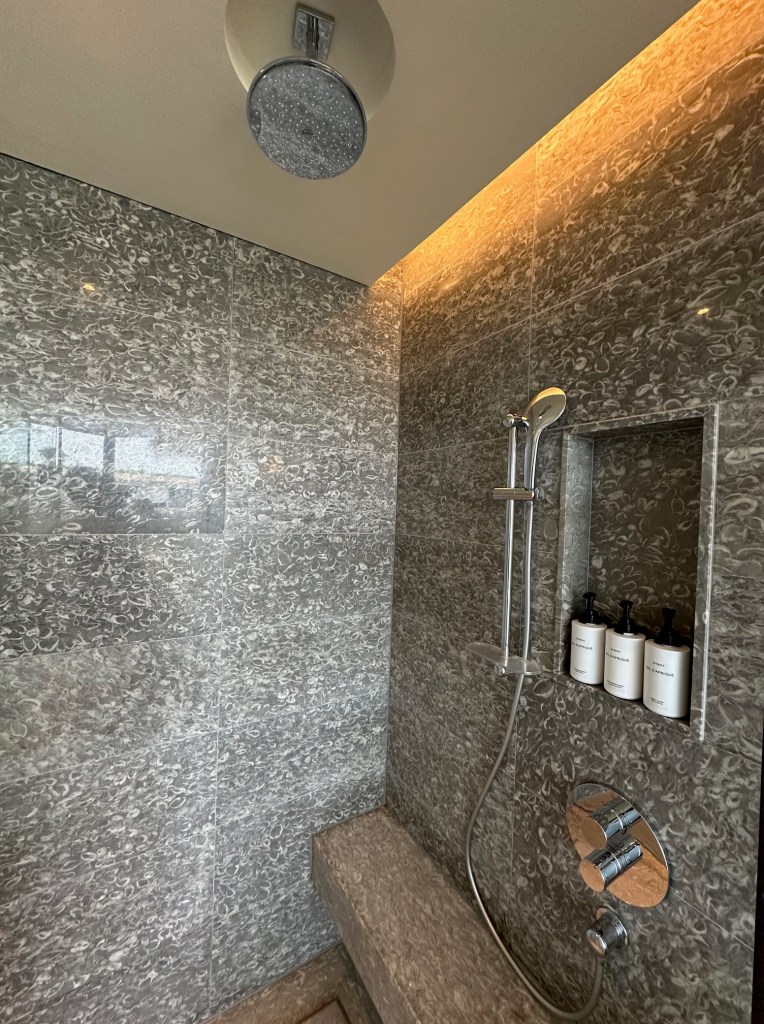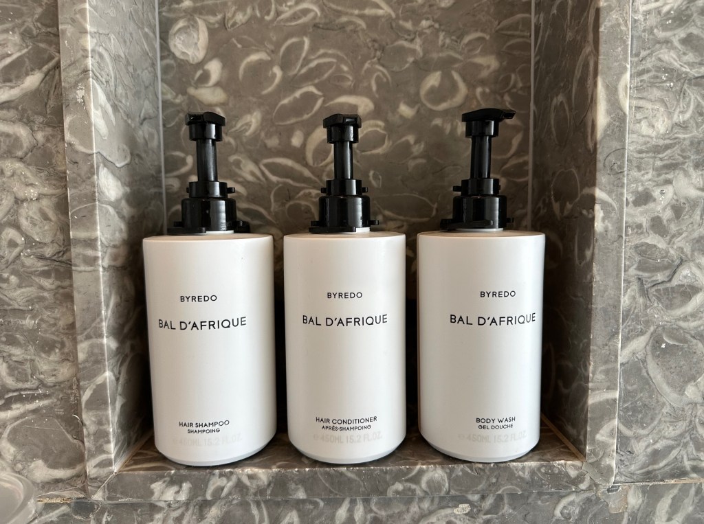 Standard amenities are all provided, including toothbrushes, a razor, and a comb. There’s a spacious walk-in shower and a separate toilet with a bidet. The amenities are the standard InterContinental brand, Byredo.