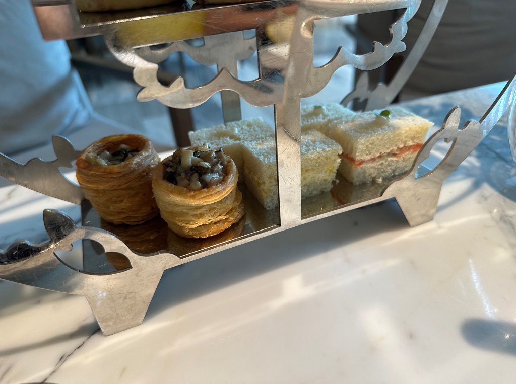It includes ham and cheese, mushroom pie, orange macaroons, scones, cake, and what seems to be a Vietnamese dessert. It was delicious.