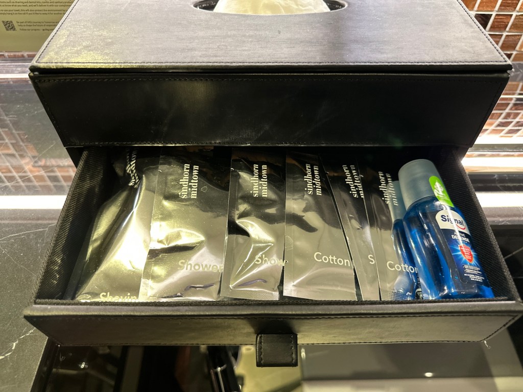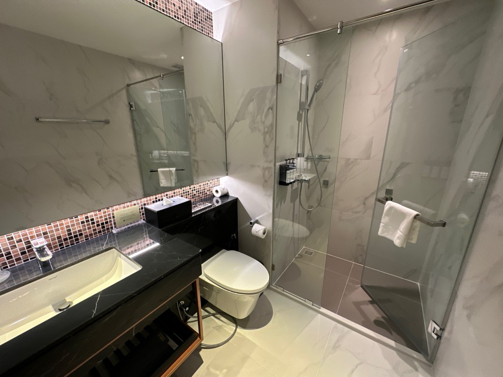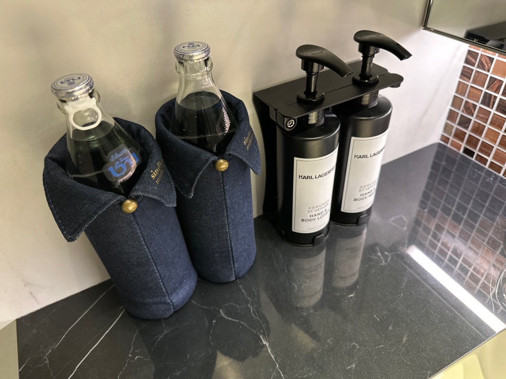 It is equipped with all the standard amenities, including a bidet spray and a toothbrush. If you need anything else, you can always ask for it. Mouthwash is also included, and the soaps and shampoos are currently from the brand Karl Lagerfeld.
