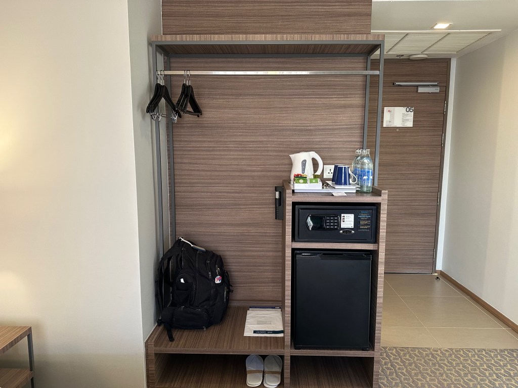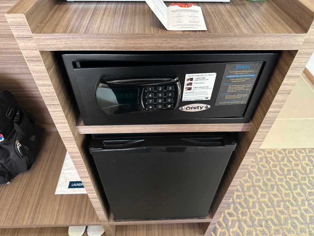 The bed was cozy, and the room was well-equipped with a safe, a mini-fridge
