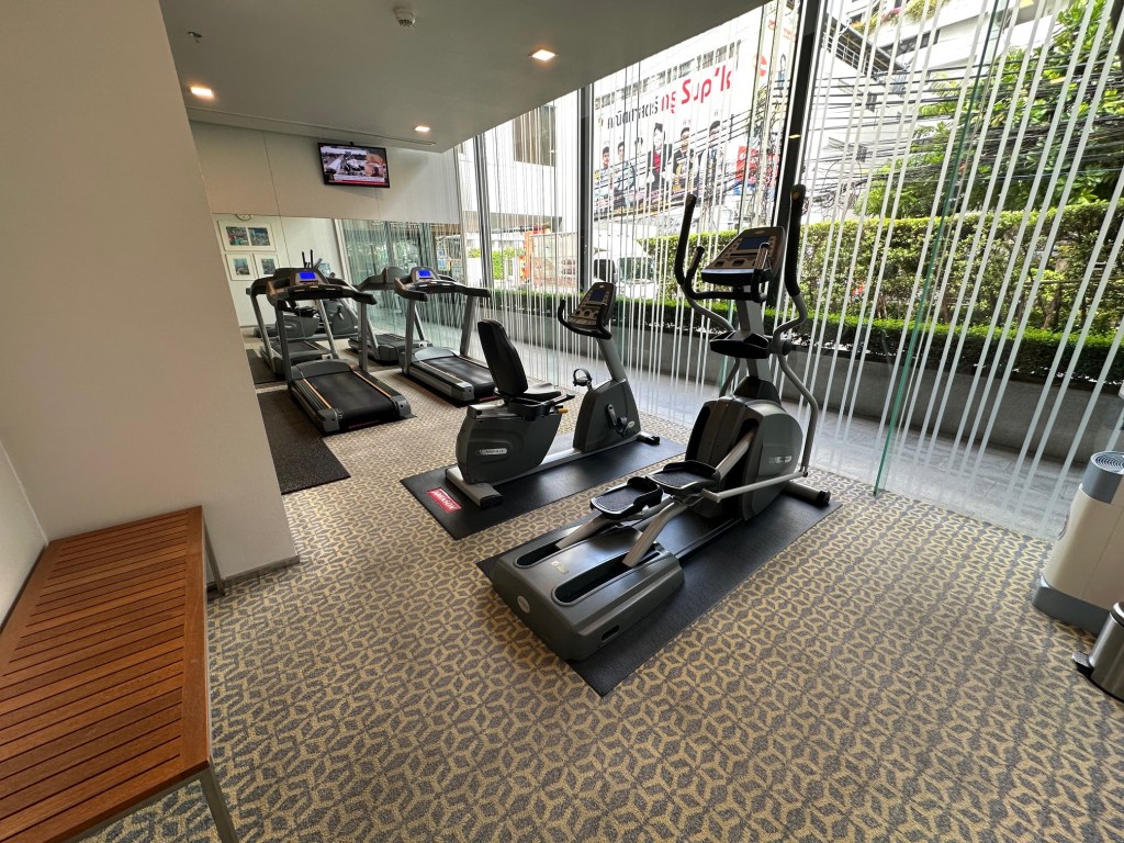 The hotel doesn’t have a swimming pool.However, there is a small fitness center on the first floor equipped with treadmills and dumbbells. Guests can access the gym using their room key.