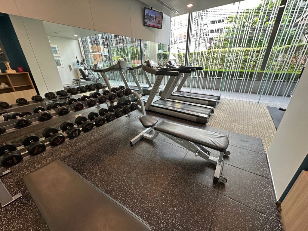 ฟิตเนส มี ลู่วิ่ง และ ดัมเบลเล็กๆ อยู่ชั้น 1 ใช้คีย์การ์ด เปิดประตู