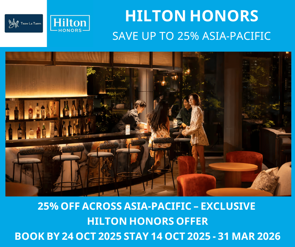 Valid for Hilton Honors™ Members only. Offer is subject to availability at participating hotels & resorts within the Hilton Portfolio throughout Asia Pacific for stays booked between October 14, 2025 through October 24, 2025. Stays are to be completed between October 14, 2025 through March 31, 2026. Offer is subject to offer details herein and the selected hotels booking terms and conditions. Offer discount is 25% off the Best Available Rate (“BAR”) or Flexible Rate, which is a specific rate type that varies depending on the time of purchase, is unrestricted, non-qualified and excludes discount or negotiated rates. Non-refundable one-night deposit required at time of booking. Your credit card will be charged immediately for first night of stay, including applicable taxes and resort fee unless otherwise indicated by local law. Charges cannot be applied to other stays, services or merchandise.