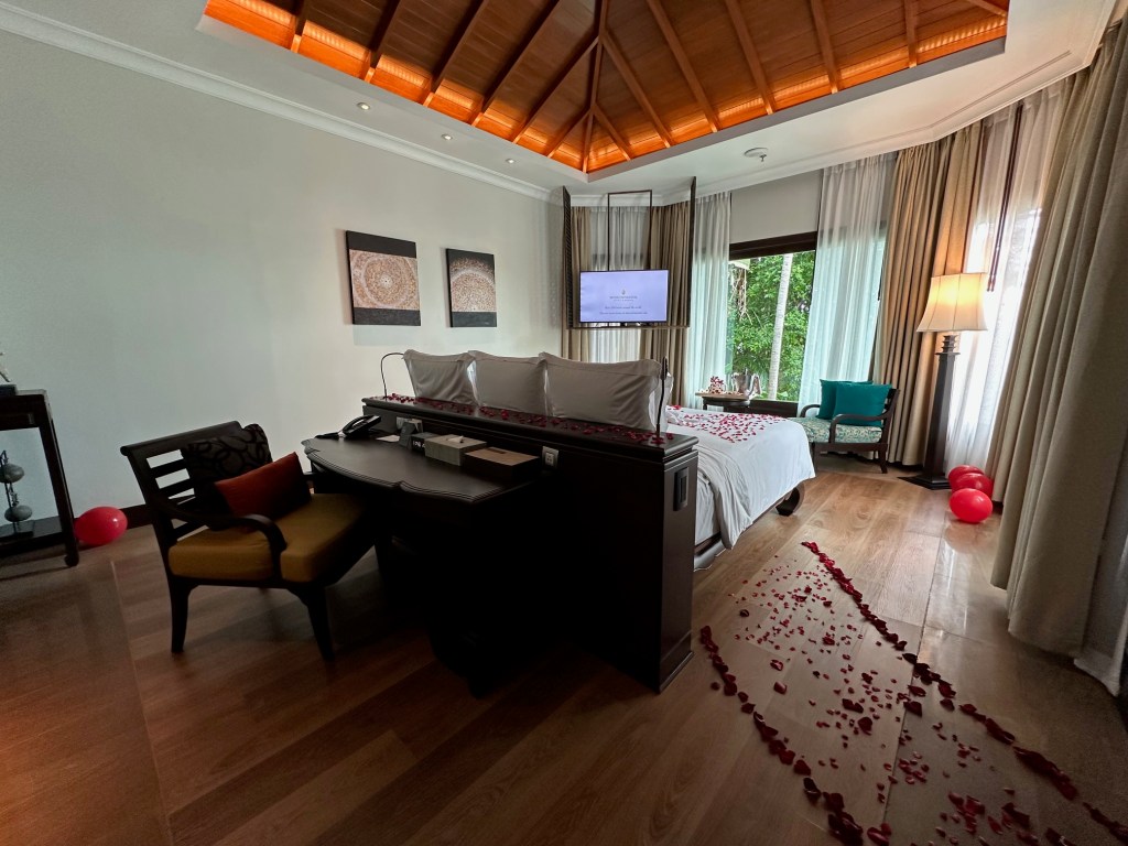 To the left is the bedroom. For this stay, the hotel decorated it with a Honeymoon/Couples theme, featuring a spectacular rose arrangement. The bed faces the ocean for a full view, and there is a dedicated workspace behind it.