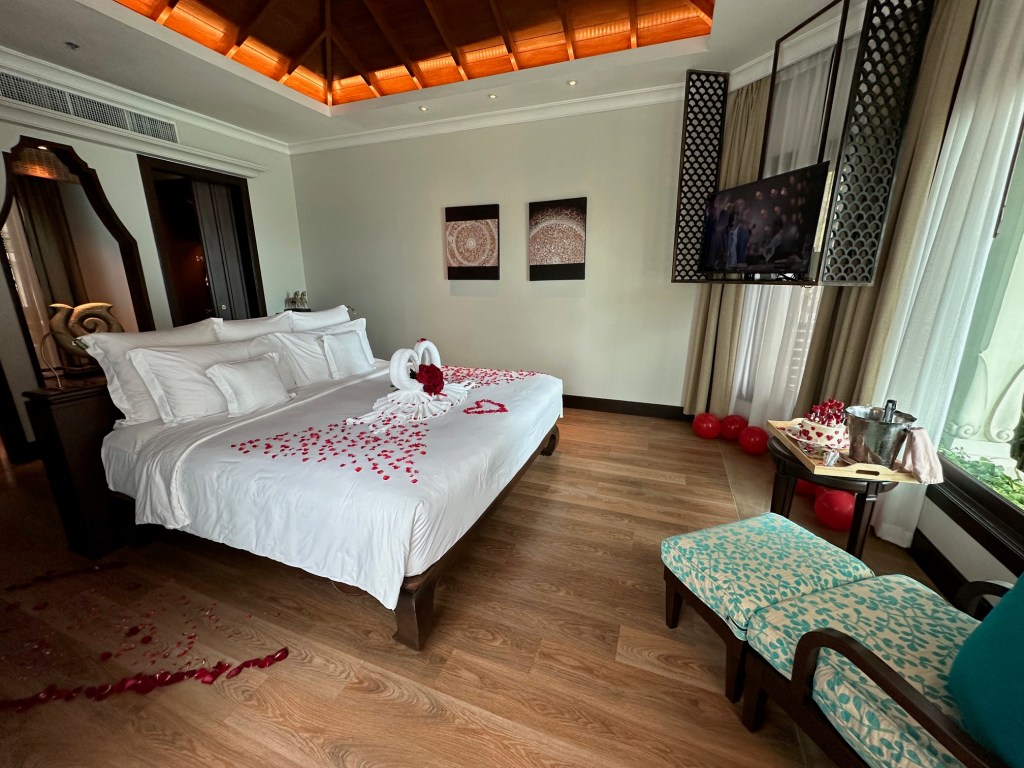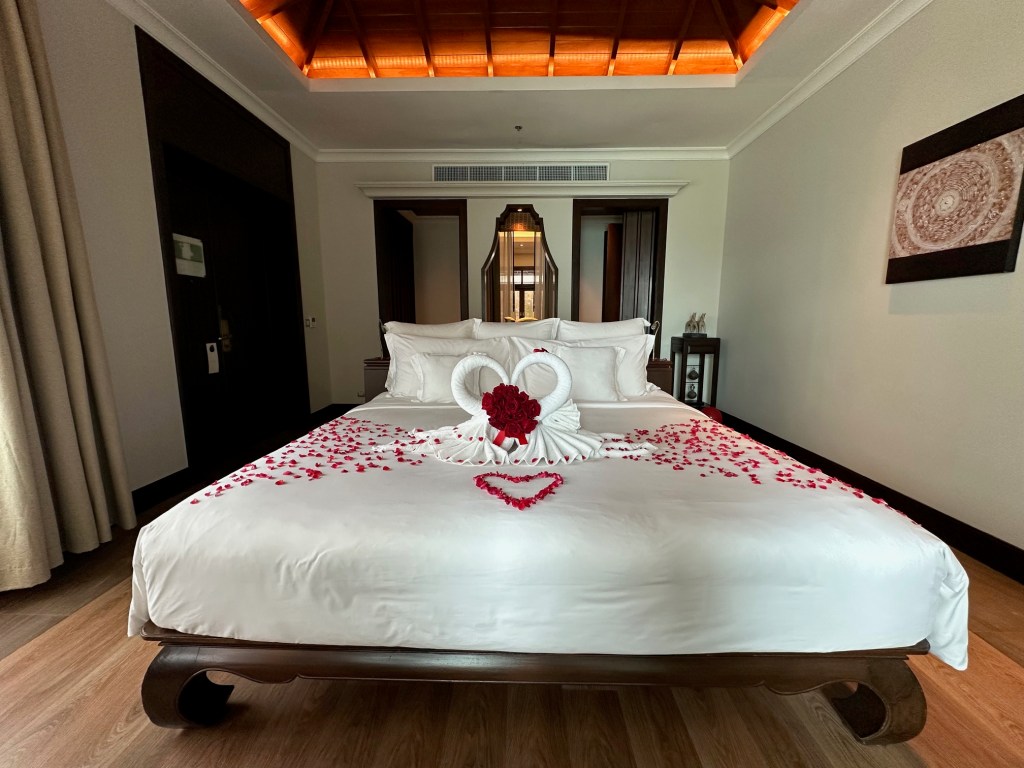 รอบนี้โรงแรมจัดห้องนอนมาเป็น ธีมแบบคู่รัก ฮันนีมูน มีดอกกุหลาบ เค้ก Sparkling Wine และห้องน้ำมีดอกกุหลาบแบบจัดเต็มๆ