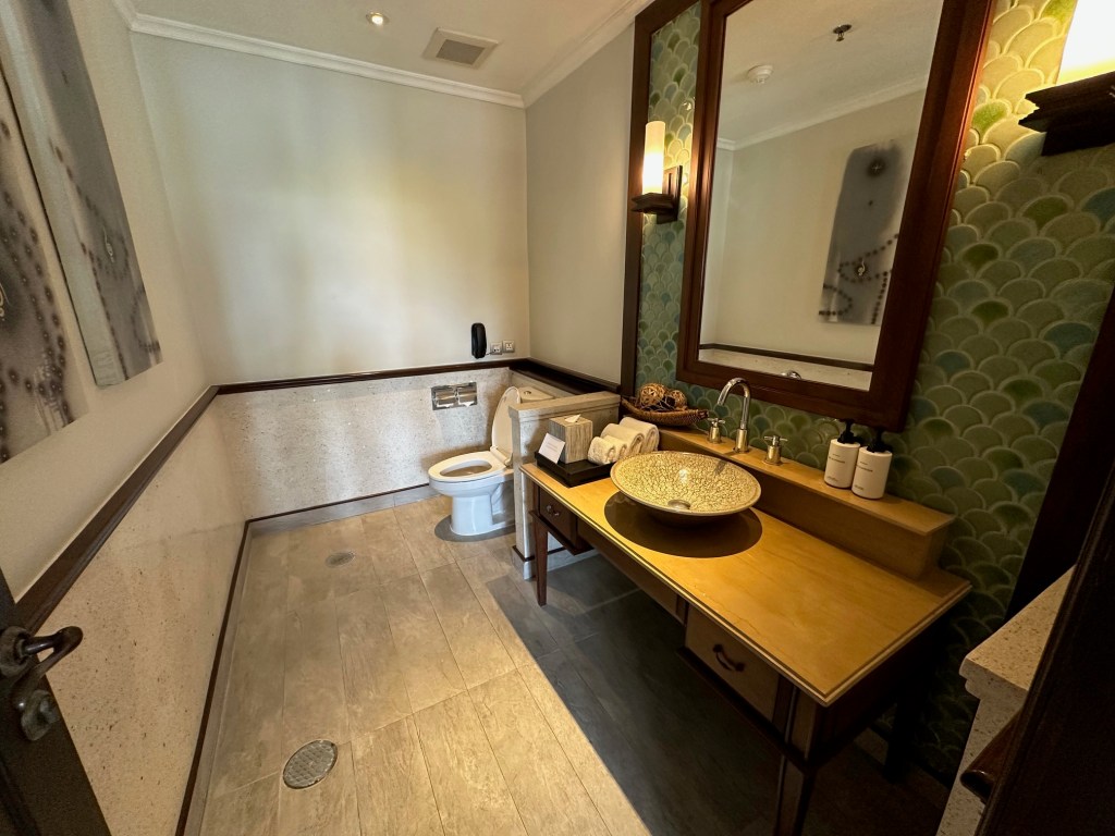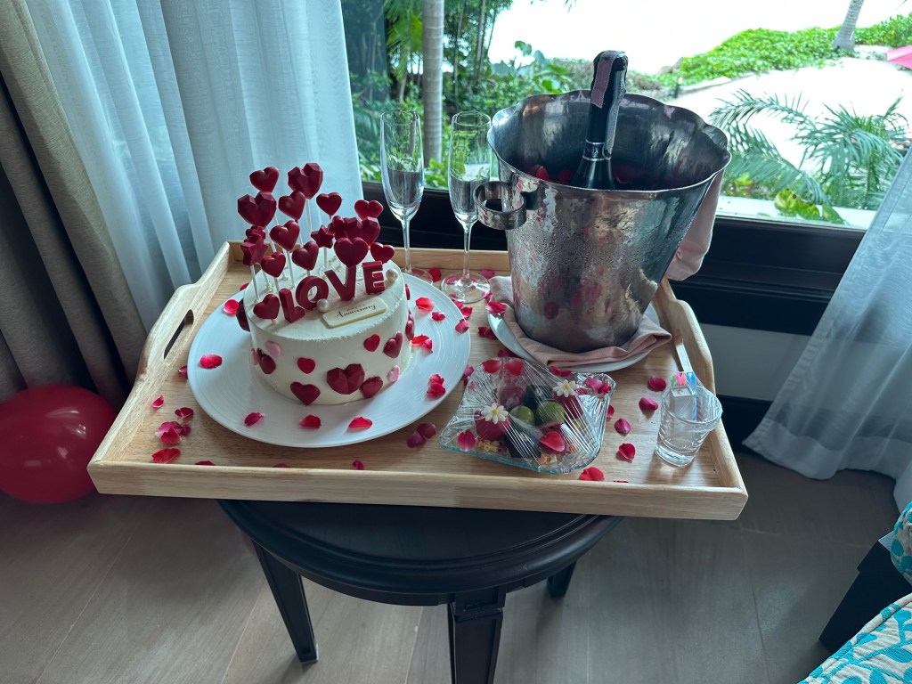 This time, the hotel decorated the bedroom with a Honeymoon/Couples theme, including roses, cake, and sparkling wine. The bathroom was also fully decorated with roses. You can actually purchase these add-ons for couples! They also offer themes for Birthdays and Beach Proposals.
