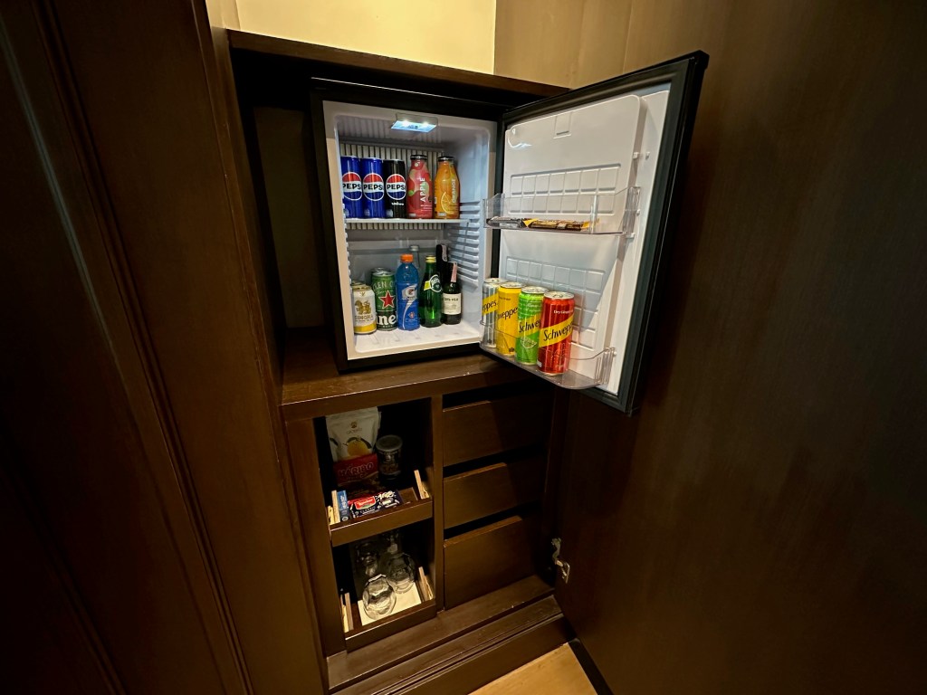 There is a wardrobe, a refrigerator, and a minibar in the bedroom. The wardrobe is fully stocked with bathrobes, a safe, and slippers.