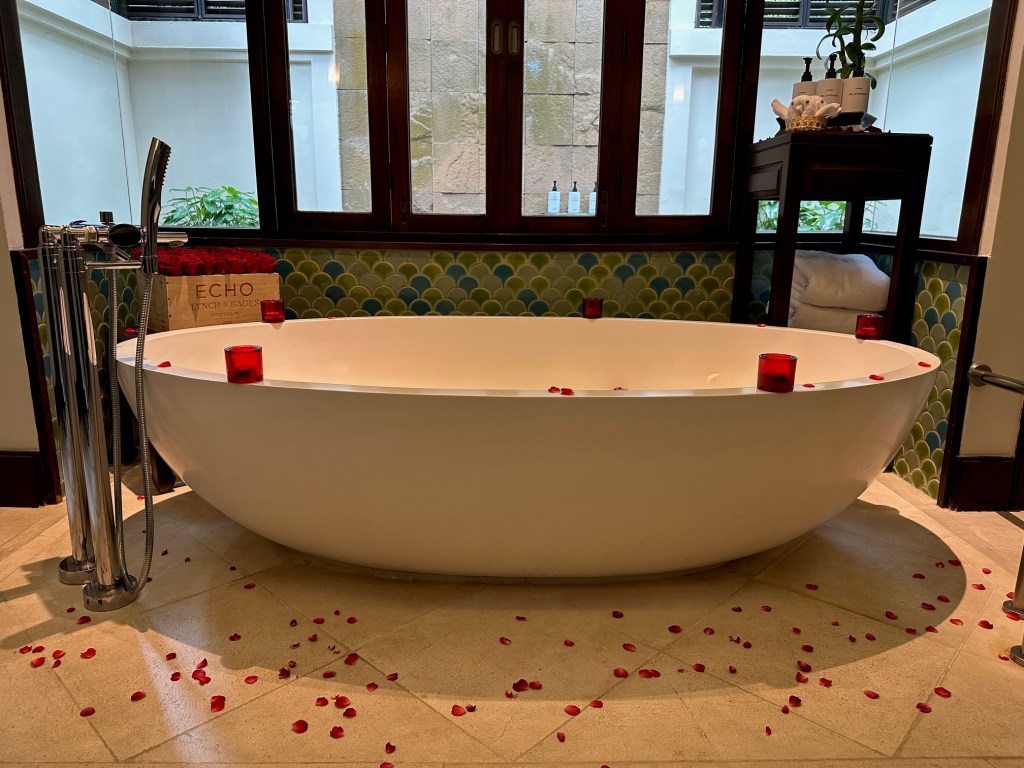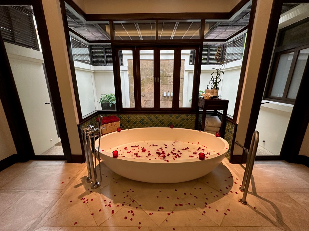 In the bathroom, there is a large bathtub situated in the center of the room, decorated beautifully for the honeymoon theme—I was very impressed! There are His & Her wash basins, fully stocked with amenities. They provide duplicate sets of amenities like toothbrushes, razors, and mouthwash.