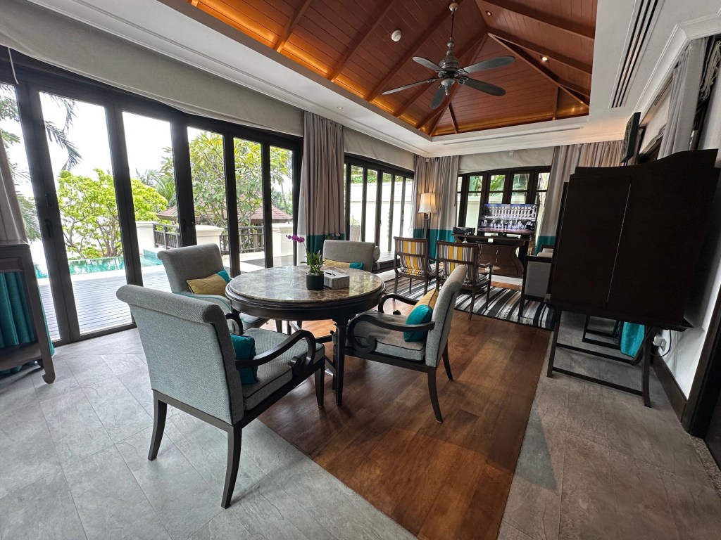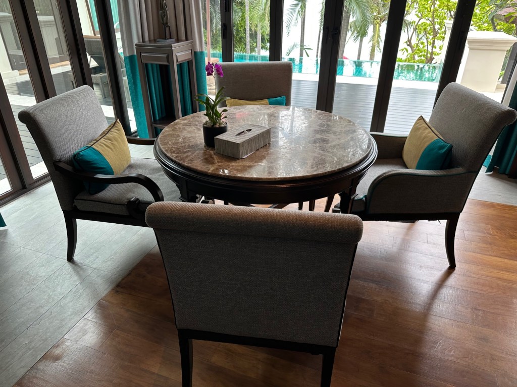 The living room has a large dining table. This villa comes with private butler service. We can ask the staff to prepare coffee or tea for us right in the room—the tea is TWG! We can also order the Afternoon Tea to be served privately in the villa!