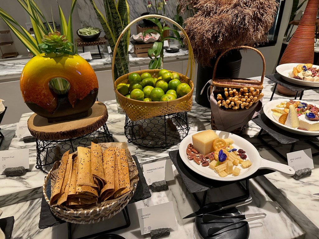 The buffet offers a variety of salads, breads, cheeses, and fruits.