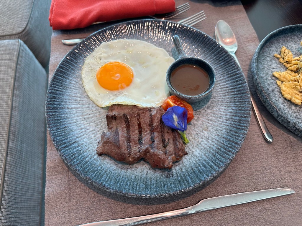 อาหารเช้า ดีงามมาก อาหารแบบสั่ง คุณภาพดีมาก นะครับ มีน้ำผลไม้สกัด Sparkling wine ตอนนี้อาหารเช้า มีสเต็กเนื้อให้สั่งตลอดแล้วนะครับ