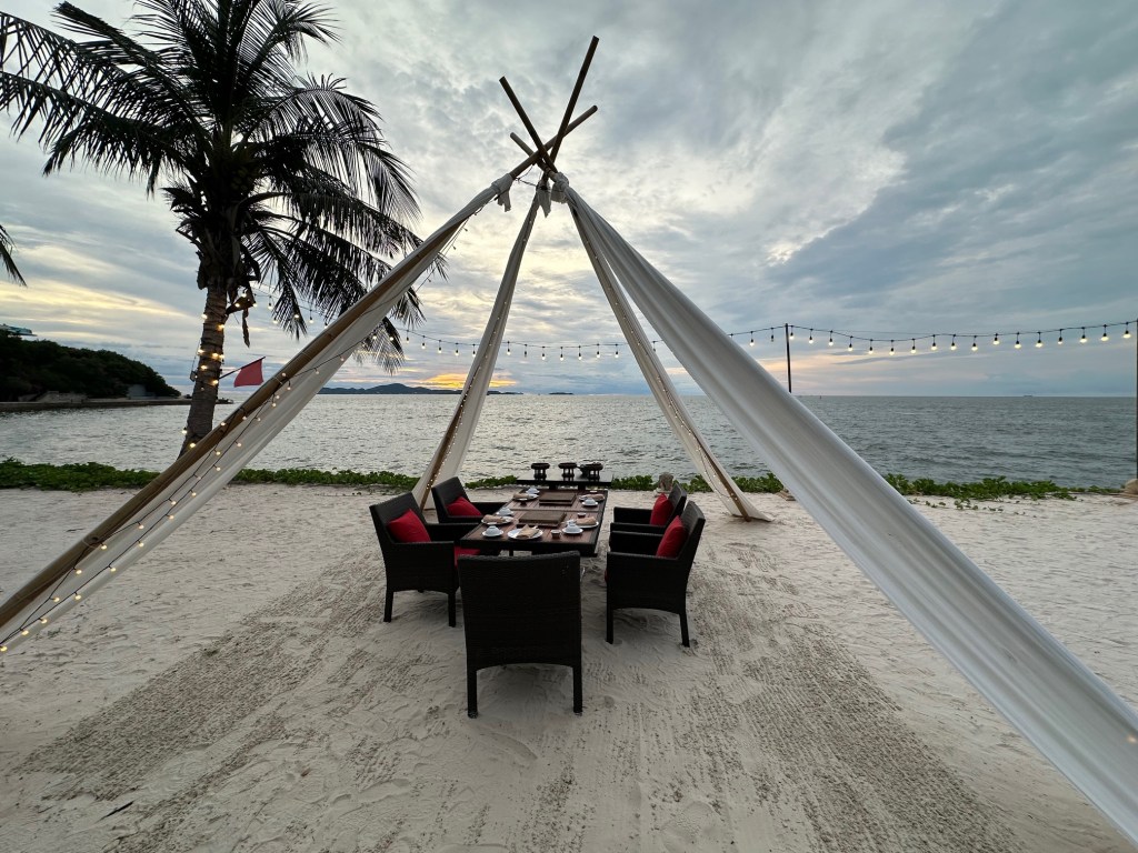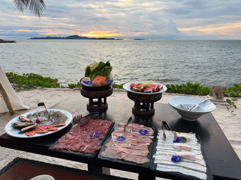 This time, we’re enjoying Moo Krata (Thai barbecue) by the sea, in an incredibly romantic atmosphere at sunset.